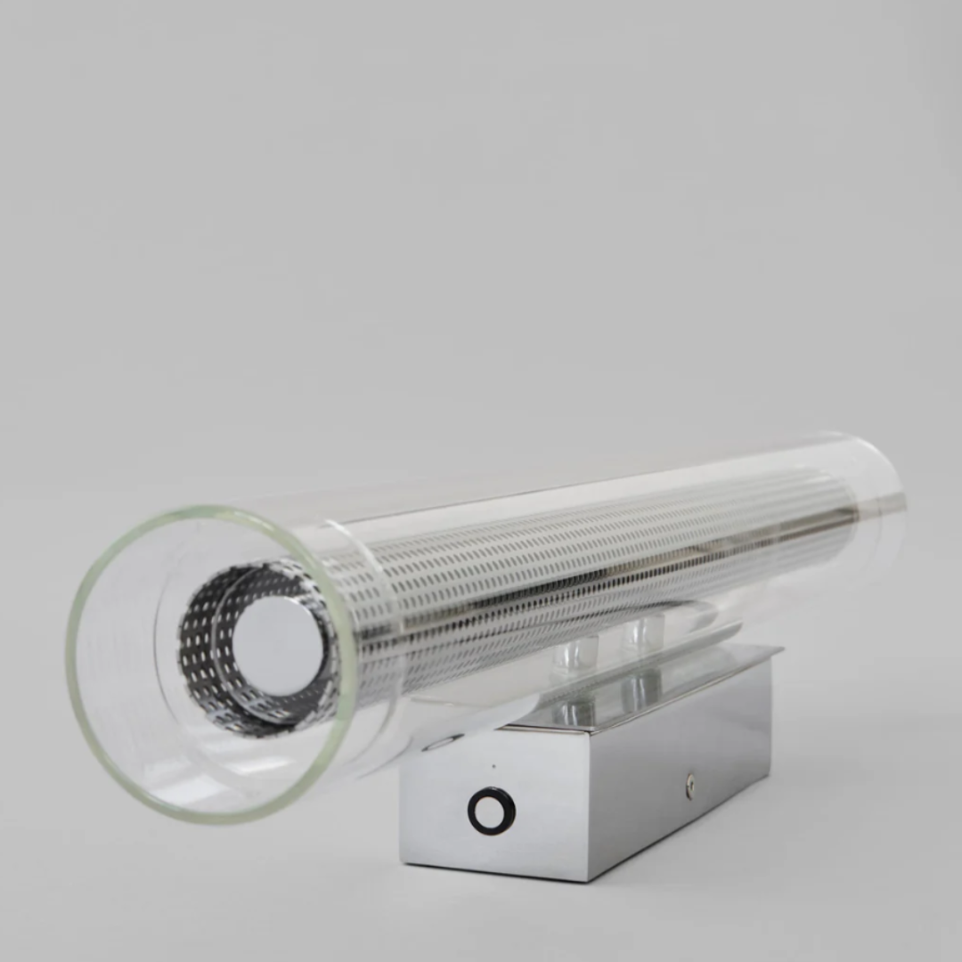 Concealed beneath the layers of perforated metal and transparent glass, the integrated LED light source sits encased in a white acrylic tube. This hidden core diffuses the light evenly, creating a warm and soft glow that enhances the depth and character of the layered design.