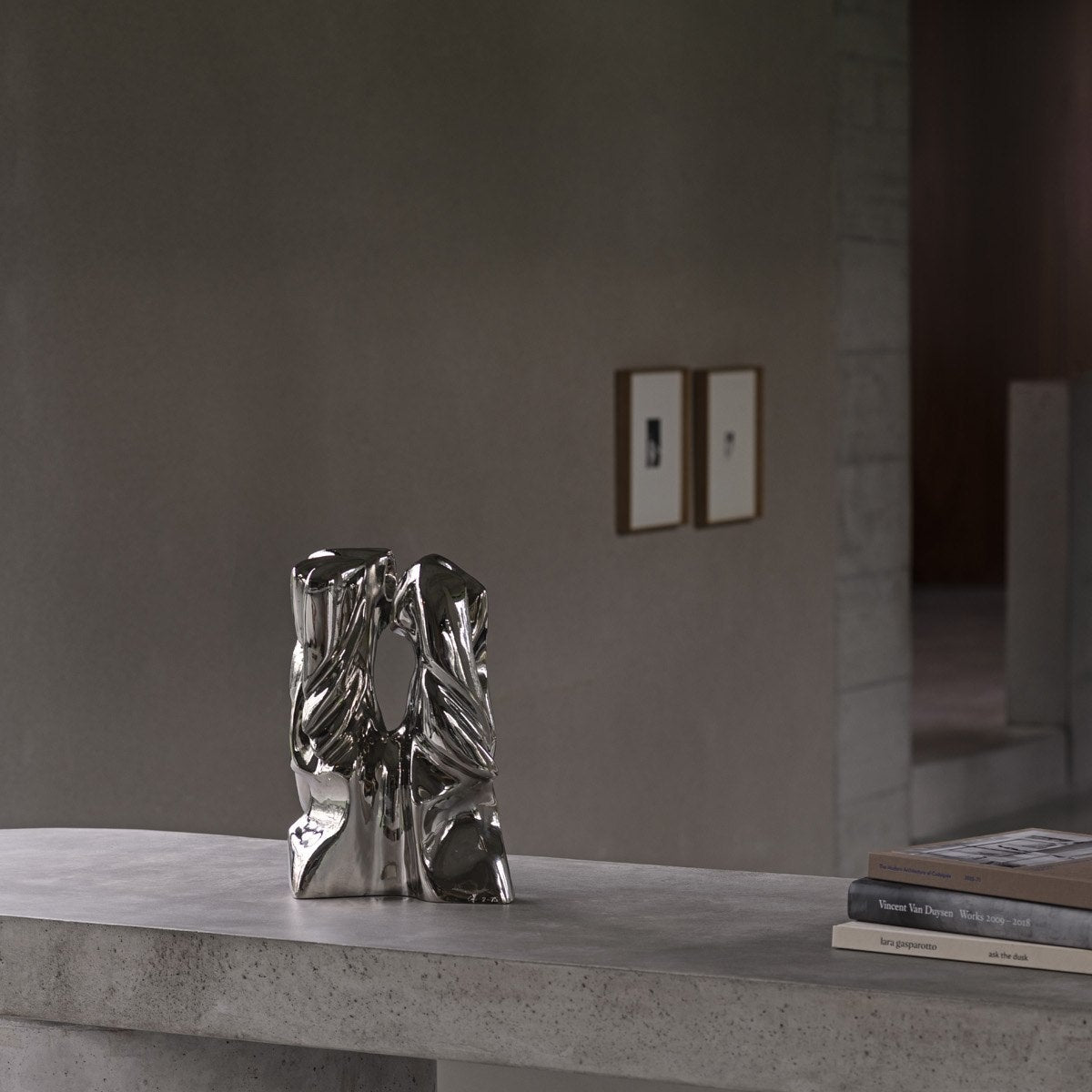 Throughout his work, Cornelius Vandeputte uses shapes that evoke movement, tension, and emotion. As a former dancer, he integrates dance into all of his designs. Shifting perspectives, a chrome-plated bronze sculpture, is a stunning example of this.