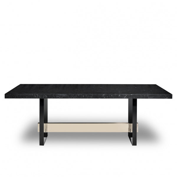 Geometry marble table combines the luxury of the negro marquina marble with the strong geometric lines of the table legs. it is made with a high gloss lacquered wood and polished brass cross bar. the table is an expressive and interesting piece of furniture, combining aesthetics and symmetry to create a truly unique design.