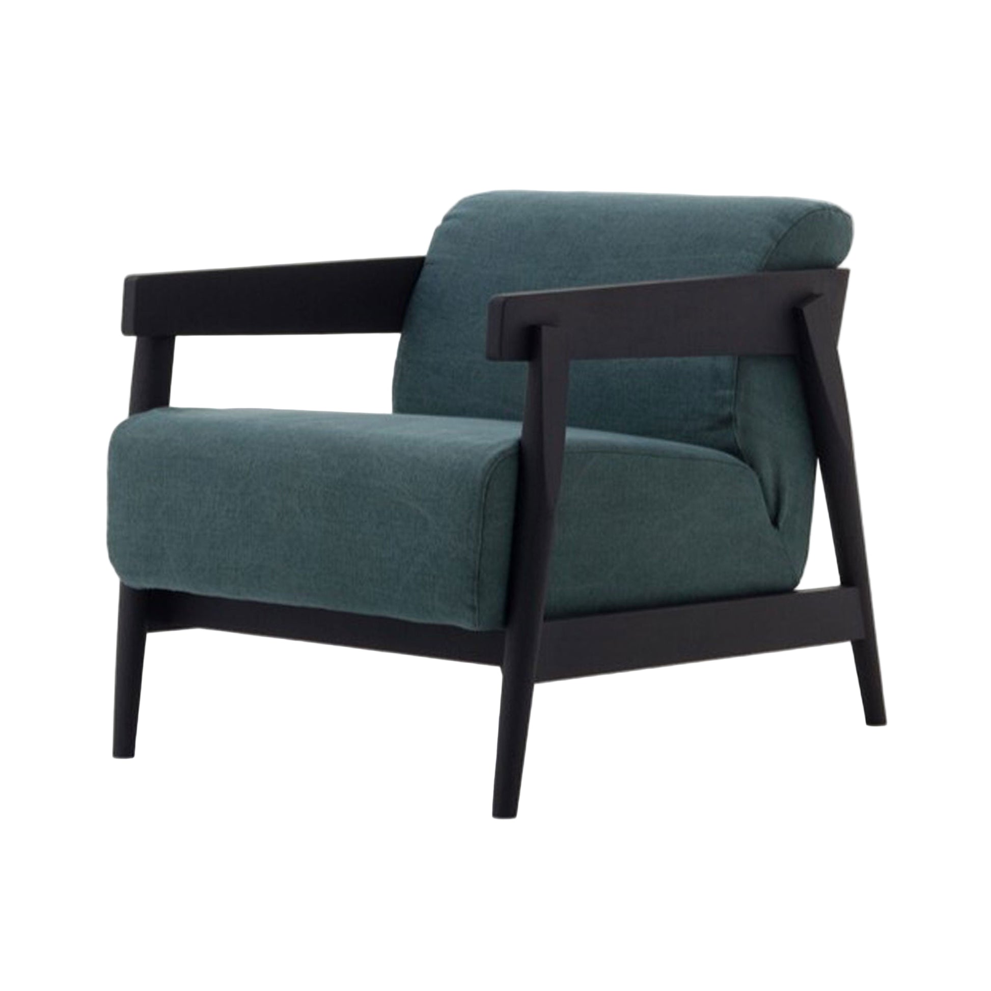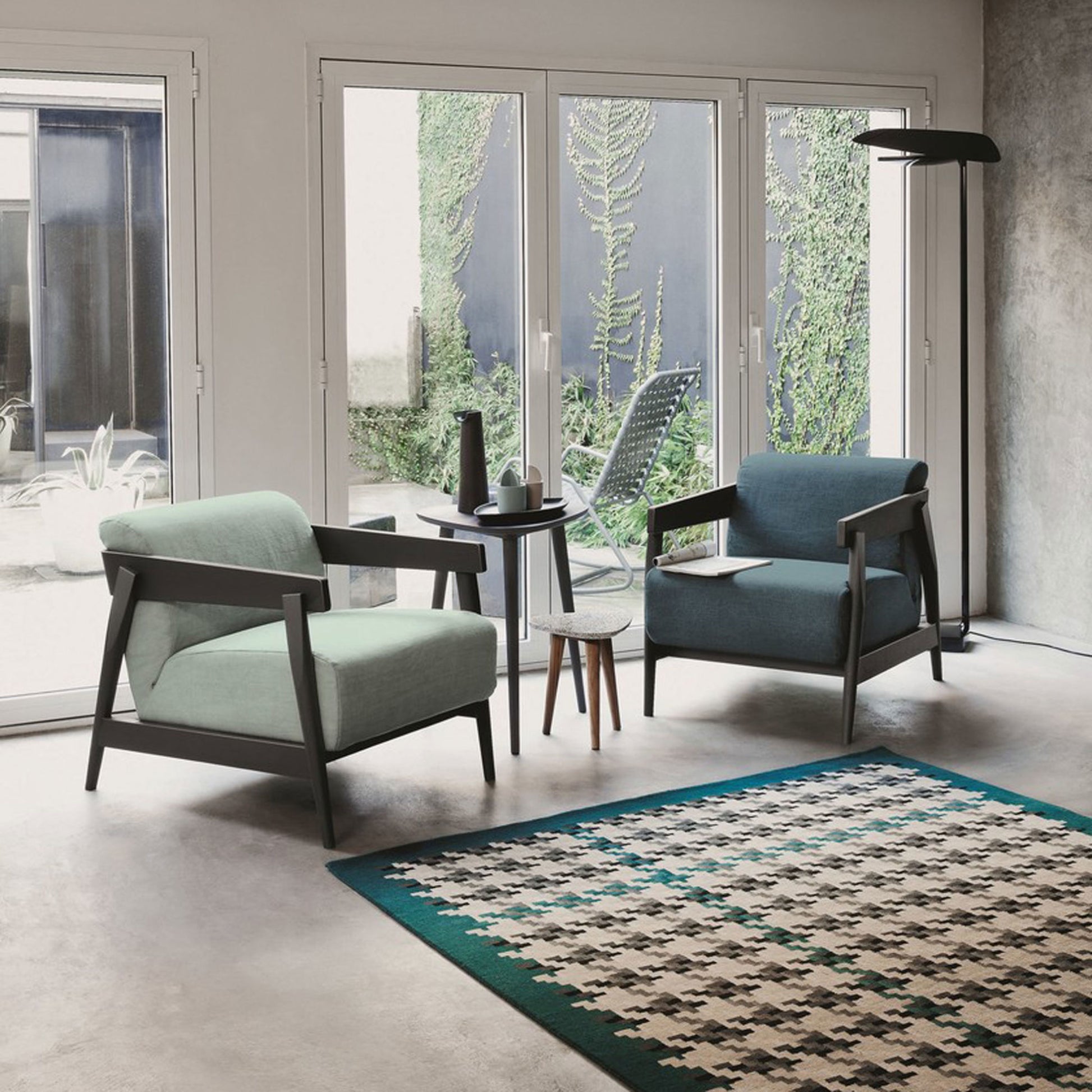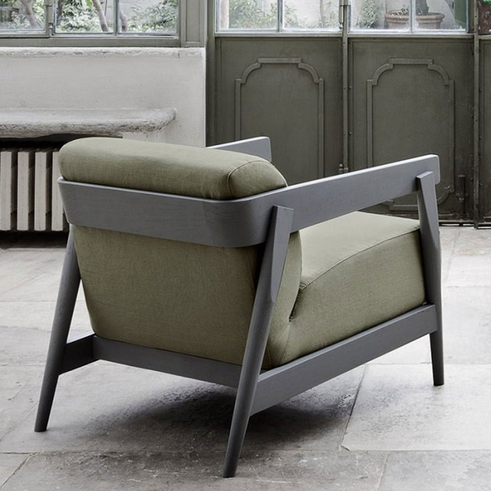 Armchair with solid wood structure in natural Canaletto walnut, bleached oak or oak lacquered in white, grey, black, ocean or dove-grey, Brick 305 has the seat and backrest softened by a single cushion padded in polyurethane foam with a removable cover. The different wooden elements that make up the structure are clear, inclined and superimposed. Armchair, frame in American walnut, oak, upholstered seat and back in polyurethane foam, removable cover. Available wood finishes: natural American walnut; bleached oak; white, grey, air force blue or black lacquered oak.