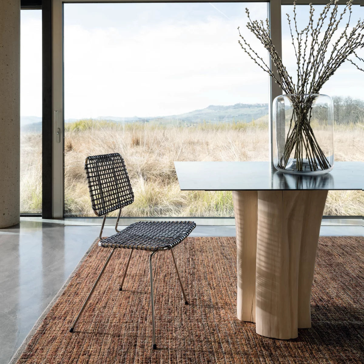 The Brick 23 chair without armrests has a structure in polished chromed steel rod. Light lines and low thicknesses are emphasised by the grey parchment weave of the seat and backrest.