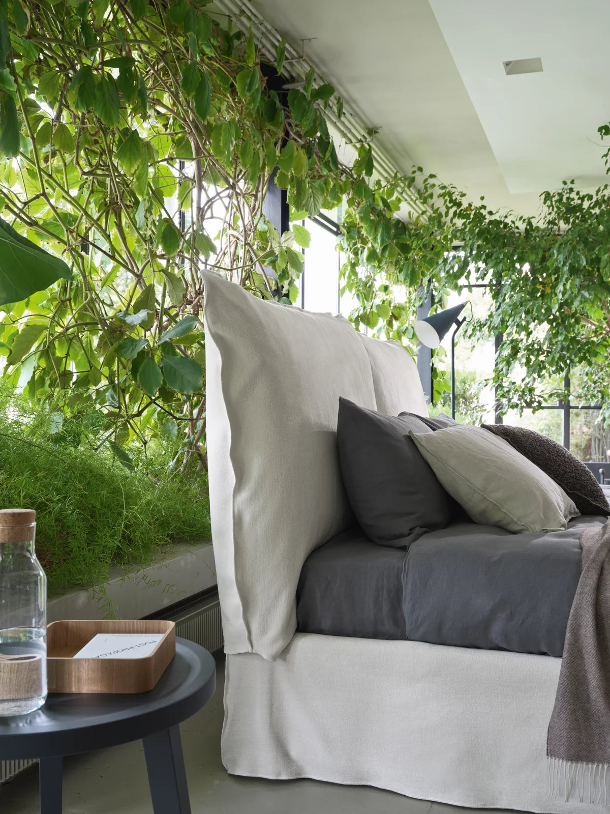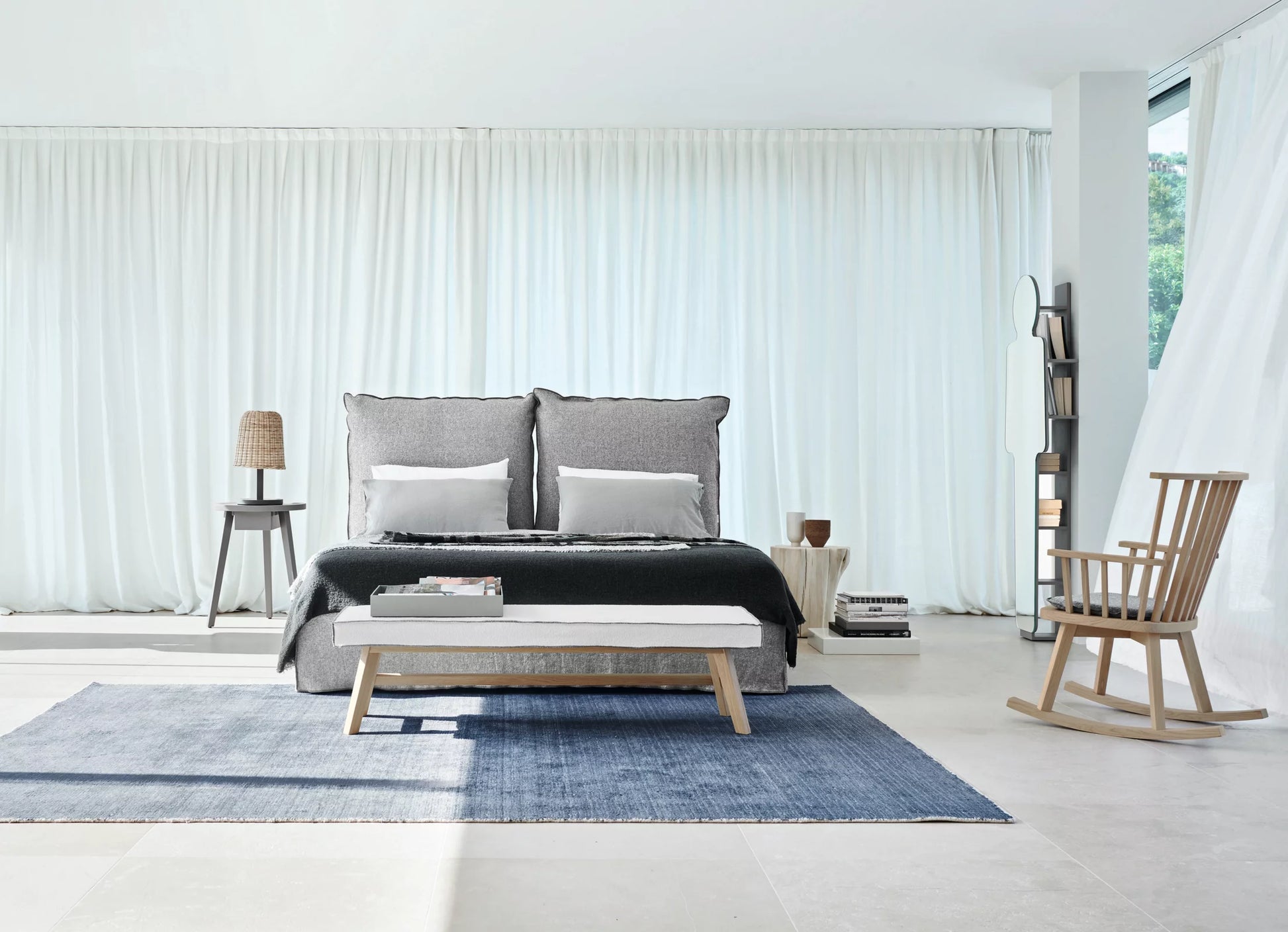 Soft and reassuring shapes inviting you to relax are what characterise Double, a removable upholstered bed, which comes with a large headboard and two oversized cushions. Double is a textile bed with a classic charm, available with velcro fastening with piping or free fastening with over-lock stitching. Feet in solid wood and adjustable slat supports. Suitable for all kind of slat frames.