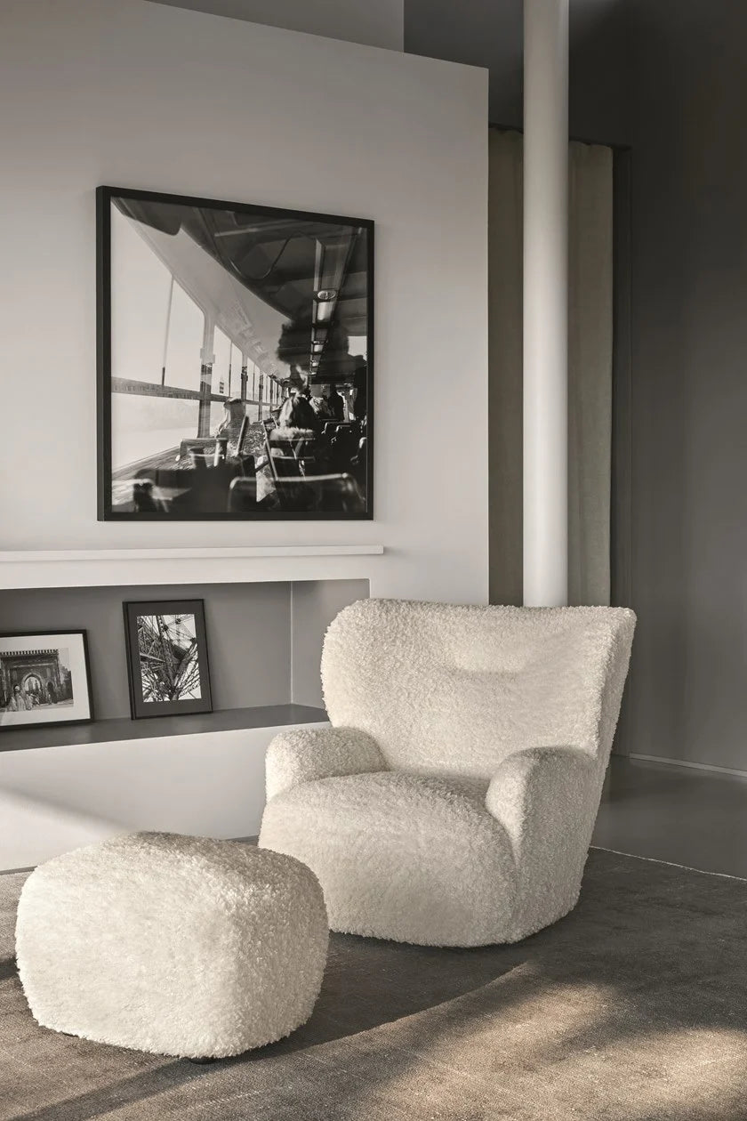 Loll 08 is the ottoman, frame in solid wood with high-rubber-content elastic webbing, upholstered with variable-density polyurethane foam. Removable cover.