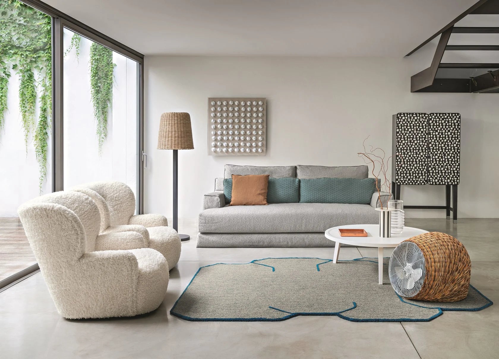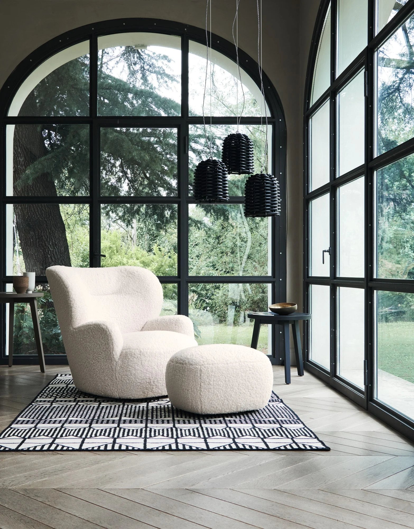 Product with an important shape, it has an enveloping structure whose particularity is found in the proportions between the seat and the backrest: the latter surrounds the seat padded with high-density polyurethane foam in different densities like a nest. The LOLL 09 armchair with solid wood structure with springing by elastic belts with a high rubber component, is characterised by a removable cover, and is further embellished by the swivel base with return mechanism. Swivel armchair upholstered with polyurethane foams, removable cover