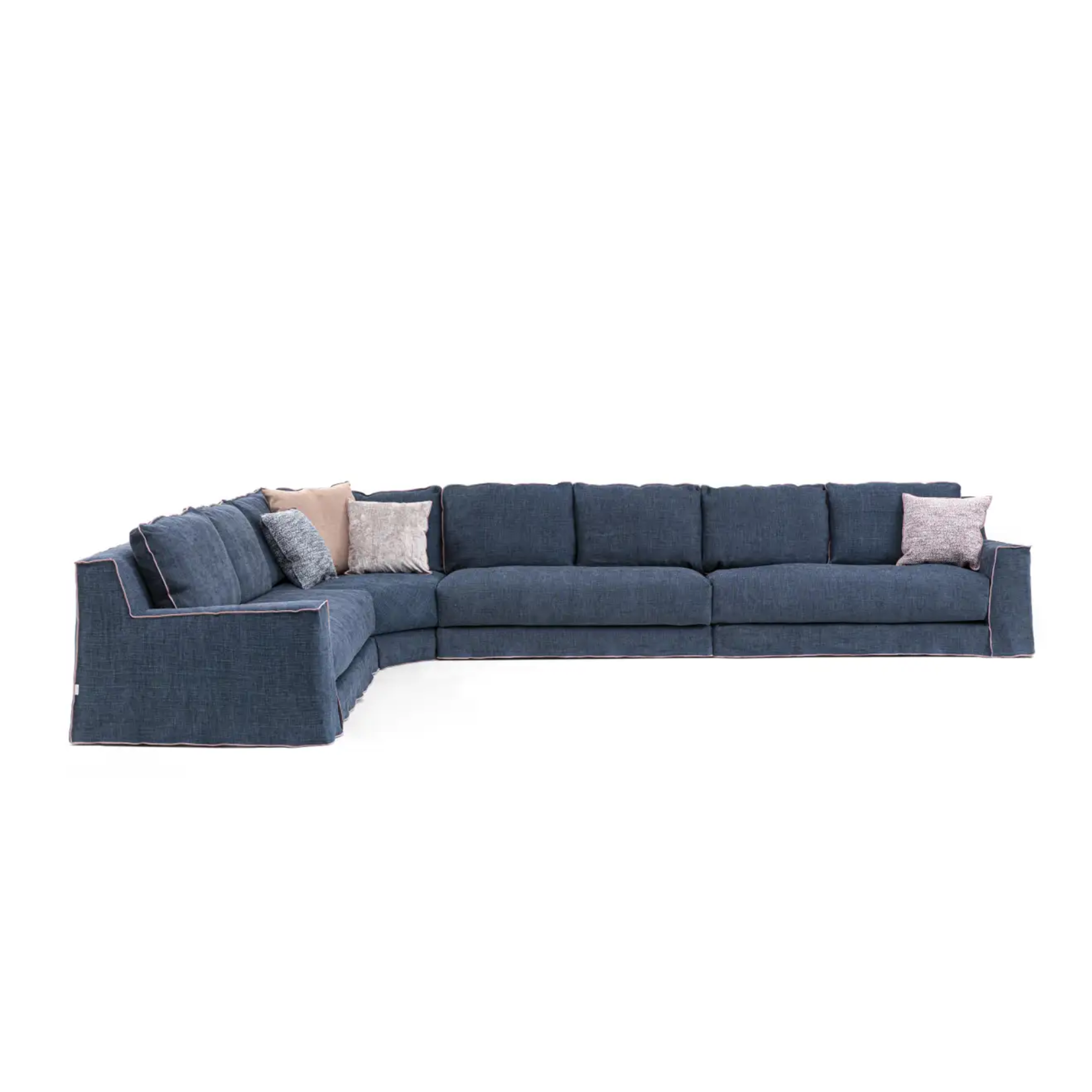 Modules of different shapes and particular corner elements of the LOLL sofa family allow you to create ever new configurations. A proposal that tells a story of contemporary comfort, made special by the attention to detail, the quality of the materials and the uniqueness of the craftsmanship, such as the profile of the sofas underlined by the characteristic sew/cut seam which, like a light line drawn by hand, follows the essential geometries and soft lines of the collection. The solid wood structure with polyurethane foam shell is combined with large seat and back cushions made with a soft layer of channelled goose down, recovering the traditional technique of using pocket springs in the seat cushions for enhanced comfort. In all its versions, the covers of the LOLL collection are completely and easily removable.
