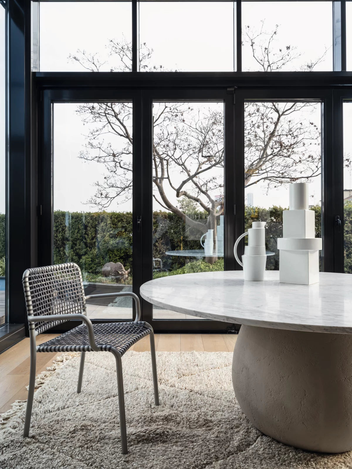 Full volumes and rounded shapes characterise the Next 232/236 table family. Available in two sizes, they stand out thanks to the sculptural central base with full shapes, made of GFRC concrete, finished with a matt grey paint, while the top is in white Carrara marble.