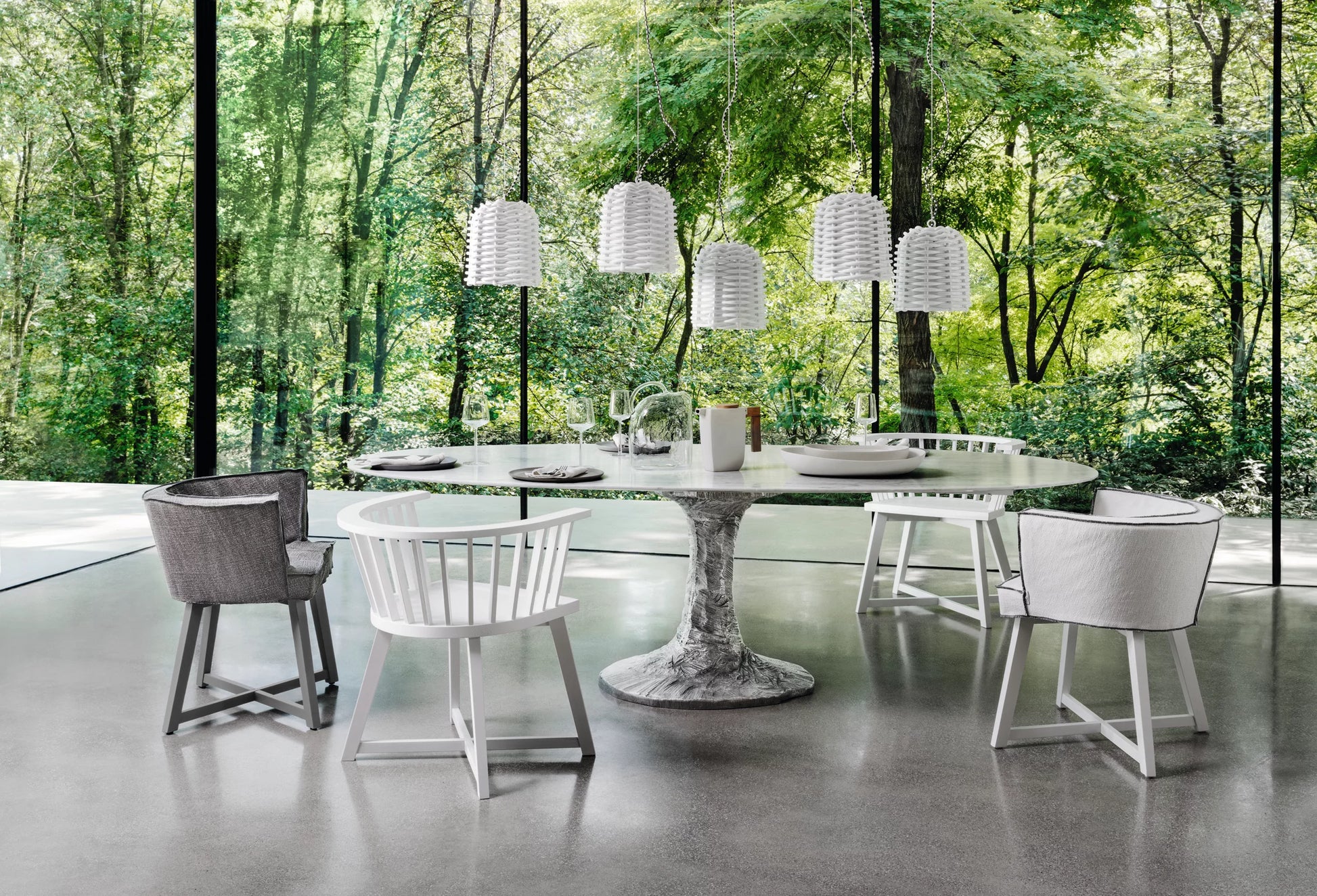 New combinations of materials characterise the Next 132/136/137/138 table family. Available with round or oval top in two sizes, they are characterised by a top available in white Carrara marble or natural painted Canaletto walnut or white, grey, black, ocean, dove-grey, date, blueberry and ginger lacquered American walnut. The base, on the other hand, is made from a single central leg made of polished cast aluminium: the light reflecting on the surface creates a visual effect that is different every time.