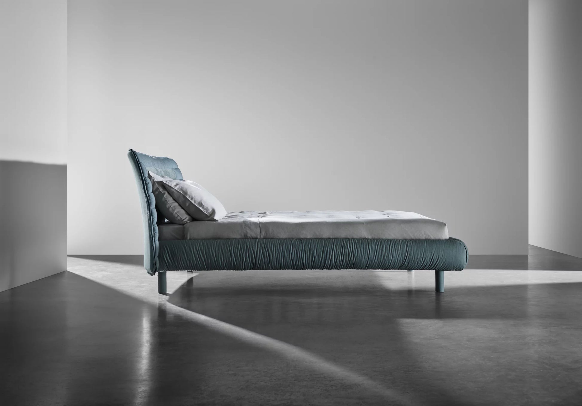 Upholstered knock-down bed. Headboard upholstered with polyurethane foam on curved plywood frame. Removable quilted fabric covers. Adjustable slat supports. Wooden feet covered with fabric. Available with all our fabrics except for 3D, WINDS.