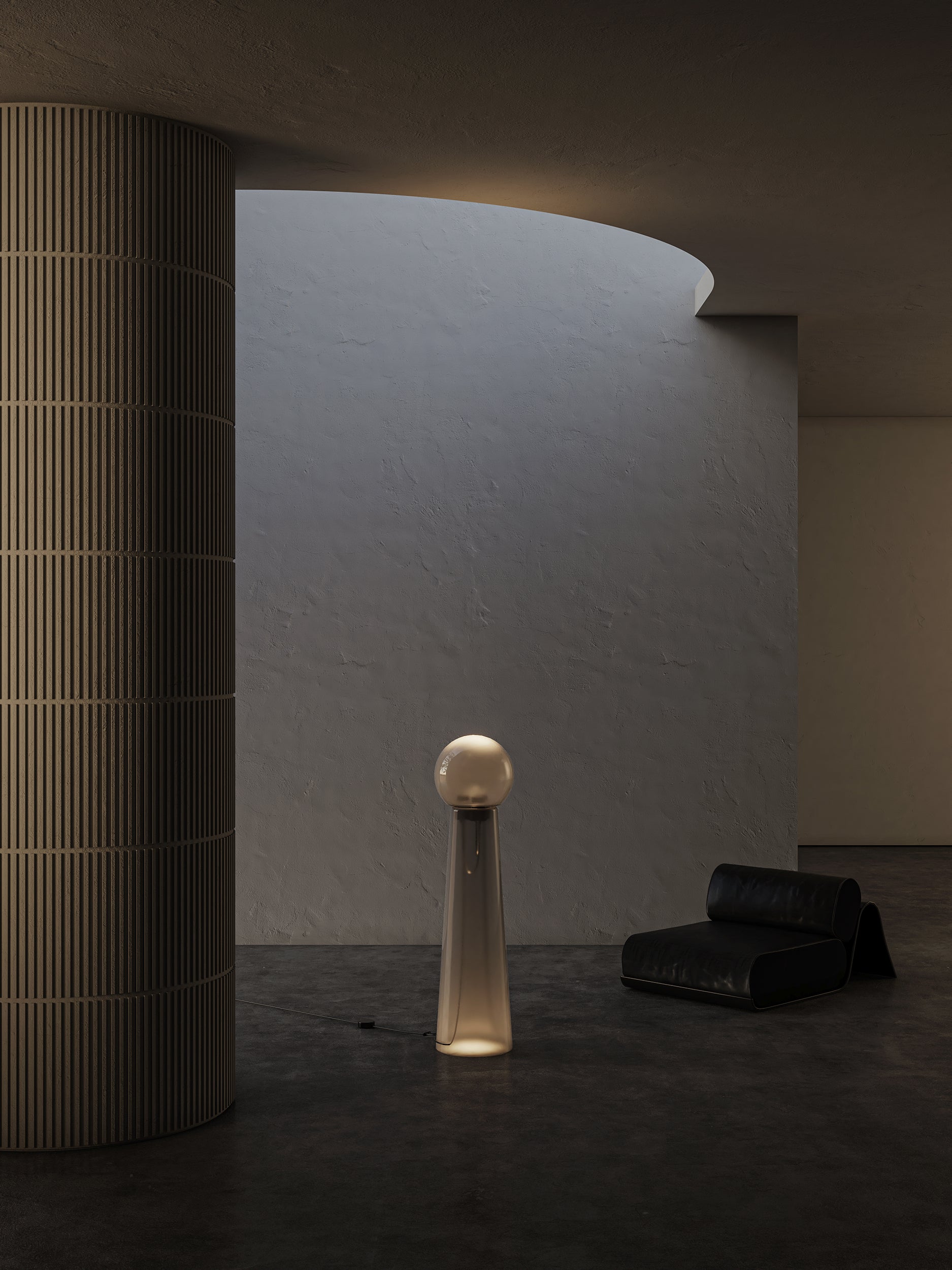 Gigi Grande, with its elegant geometry and its refined details, stands in the space like a beacon of glass and light. Created under the breath of the glassblower, its shades and its glass components are unique, making each lamp an exclusive object.