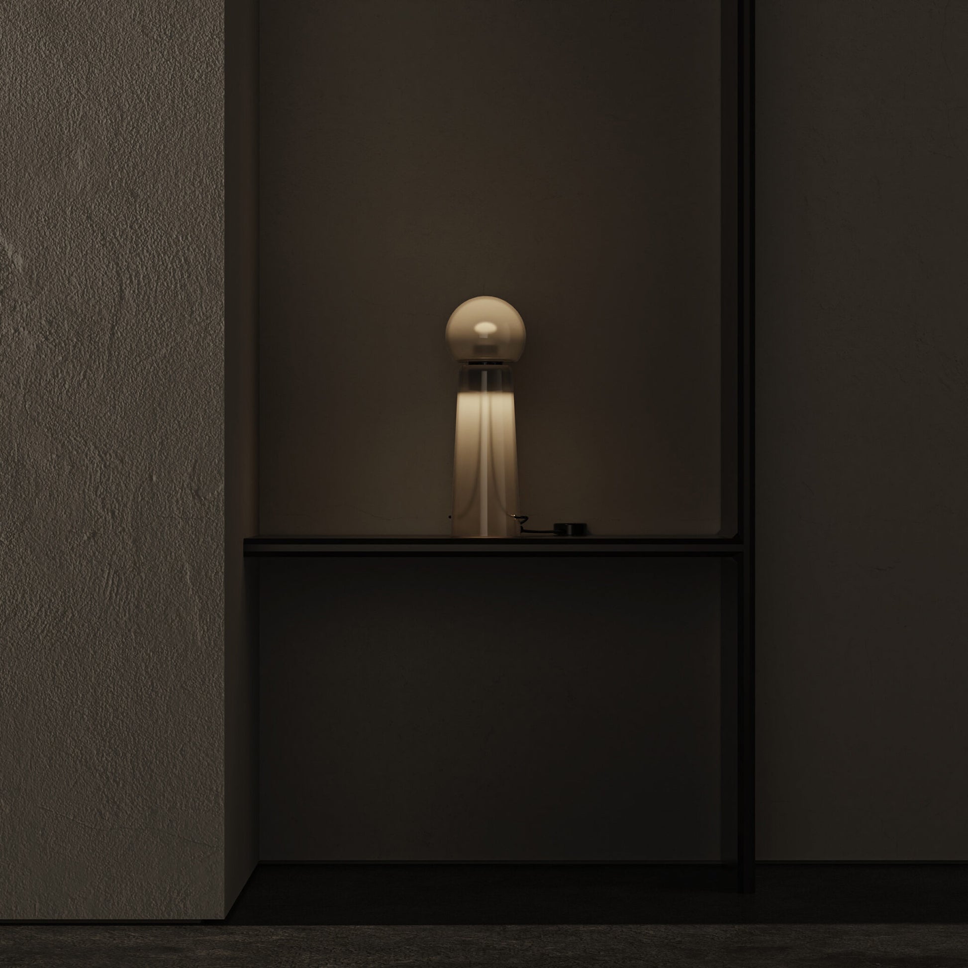 Gigi was the result of a professional love affair between Studio Darmes and Verre d’Onge. This joint project is the alliance of two domains: the mastery of glass and of light. Its very existence emerges from a creative process focused on pleasure and an exploration of its physical nature, of the sensory experience of its presence in space, both in its table and floor version.