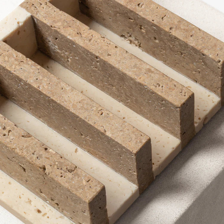 With its monolithic, purely geometric volumes, this collection for the office is characterized by graphic details born from the juxtaposition of two nuances of travertine, which creates a distinctive visual contrast with the material and porous aspect of such marble. Design by Simone Fanciullacci.