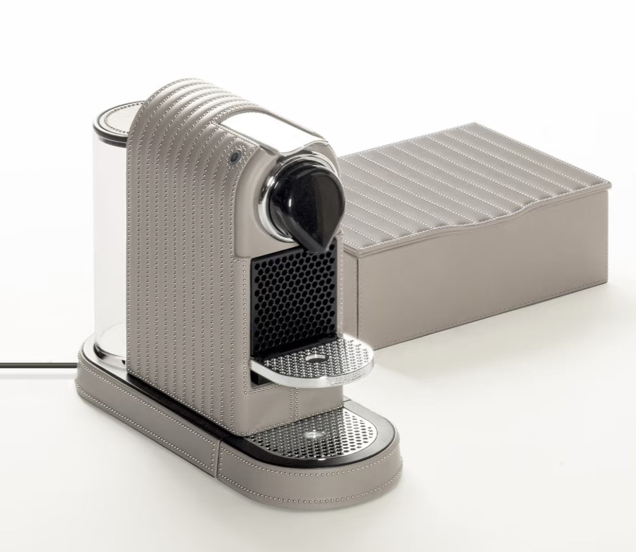 Original Nespresso machine dressed in leather with a diamond quilt pattern generated by the juxtaposition of small studs. It uses classic Nespresso capsules. Also available in the 110V version, please enquire the Concierge for more details. OTHER FINISHES AVAILABLE.