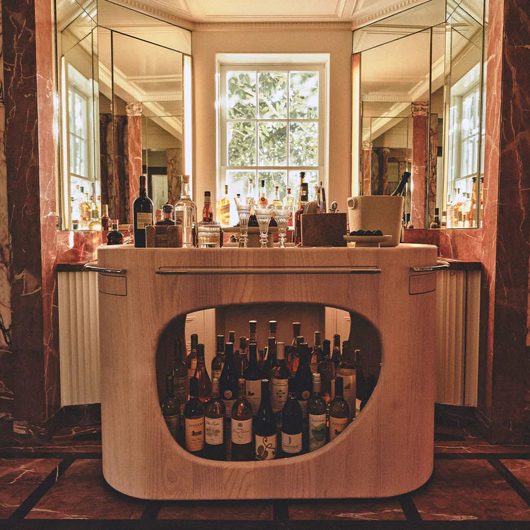 The Maris bar console by Kelly Wearstler embodies a sophisticated fusion of luxury and artistry, deftly merging form with function. This exquisite piece features a stunning marble top that serves as a striking centerpiece, surrounded by a meticulously crafted wooden structure available in either a natural or wenge finish. The design draws inspiration from the serene aesthetics of coastal landscapes, with organic shapes reminiscent of smooth pebbles and gentle waves. Polished chrome handles add a modern touch, while the leather-covered lower level provides a refined contrast, featuring a centered wooden platform for added utility. Functionality is key with the inclusion of two side drawers, perfect for storing additional accessories, along with a pull-out shelf that extends operational space. The neutral color palette allows for seamless integration into various interior settings, making this bar cart not just a piece of furniture, but a statement of timeless elegance and universal appeal.