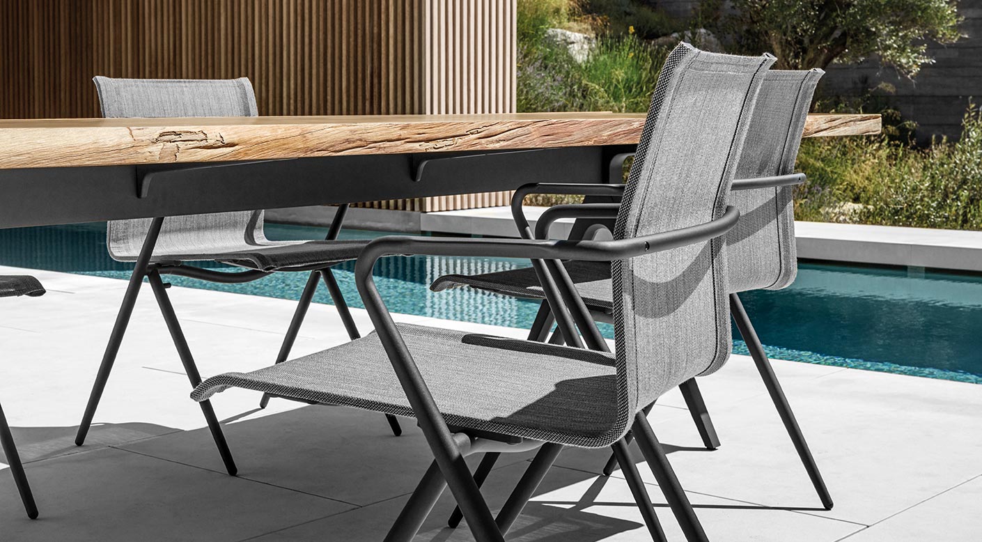 Powder coated stainless steel frame. Sling seat & back.
