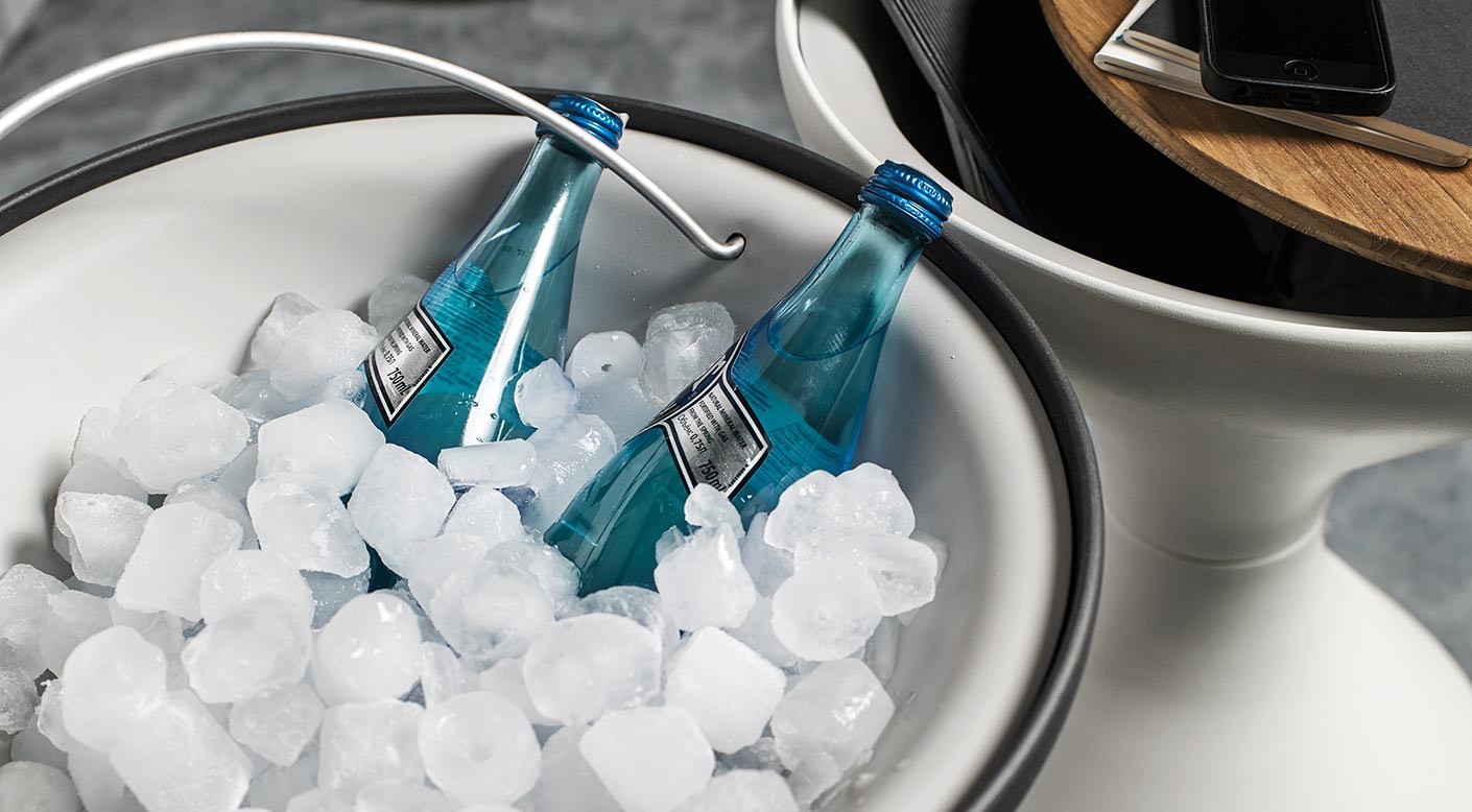 Powder coated aluminium frame. Natural finish teak table top. Ice bucket insert included.