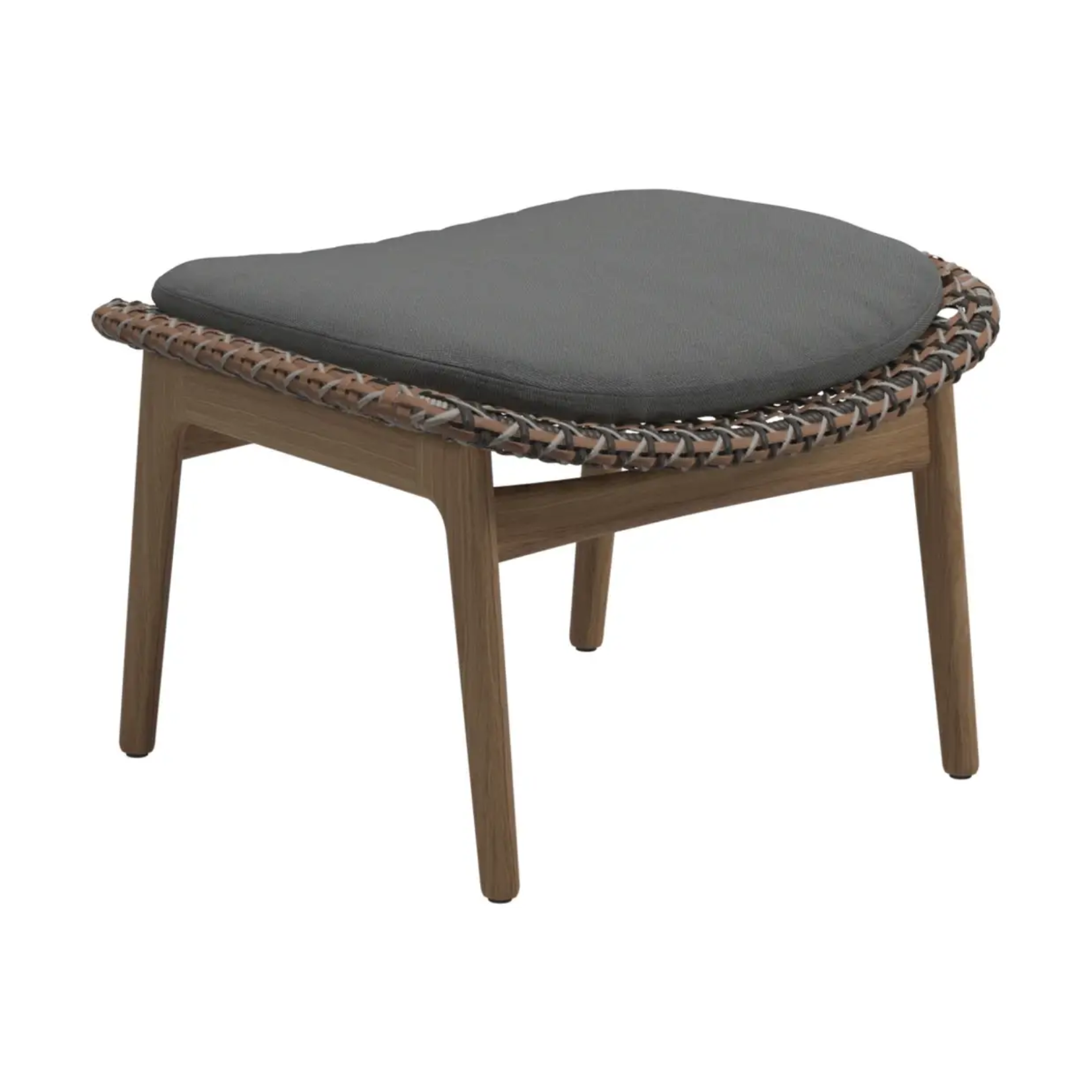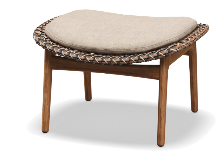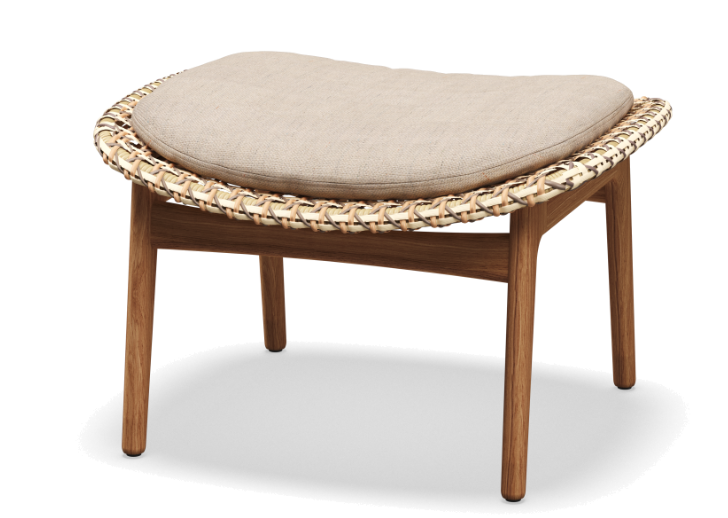 Natural finish teak frame. Woven all-weather wicker seat panel. Seat cushion required.