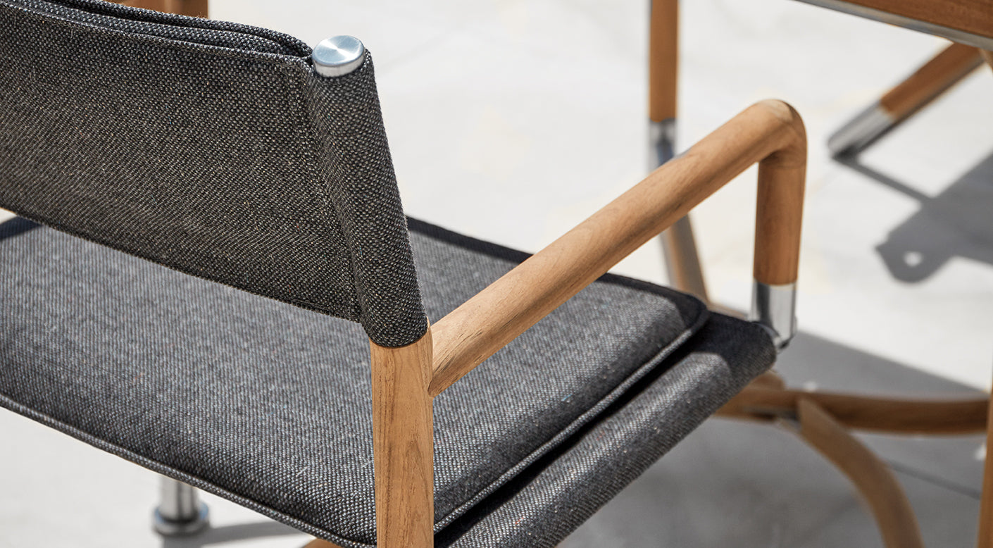 Natural finish teak & brushed stainless steel frame. Fabric seat & back cushion. Folds flat. Cushions required.