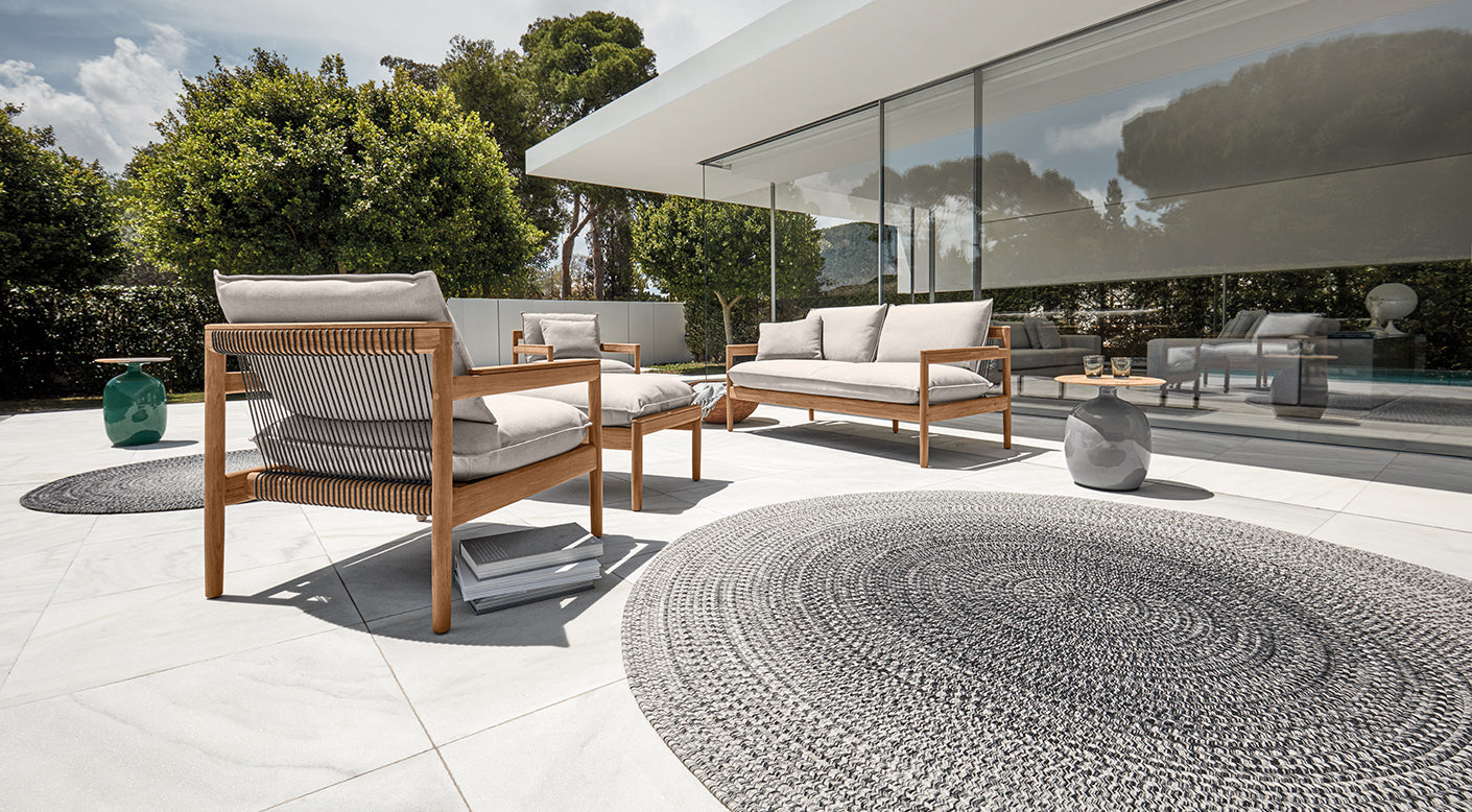 Natural finish teak frame. Raven colour, woven outdoor rope back panel. Outdoor fabric seat & back cushions required.