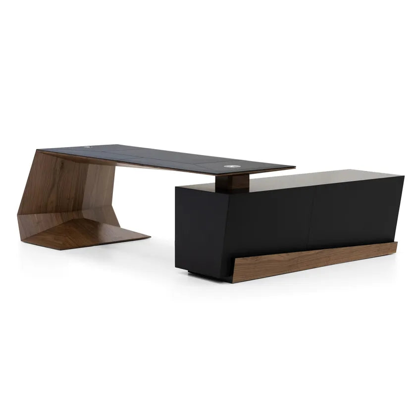 Desk: Top & external side in leather art. Cuoio col. Pure Black, undertop & internal part of the leg in veneer Venice, lacquered parts in Black matt finish, metal logo TL col. Nickel with Red shield.