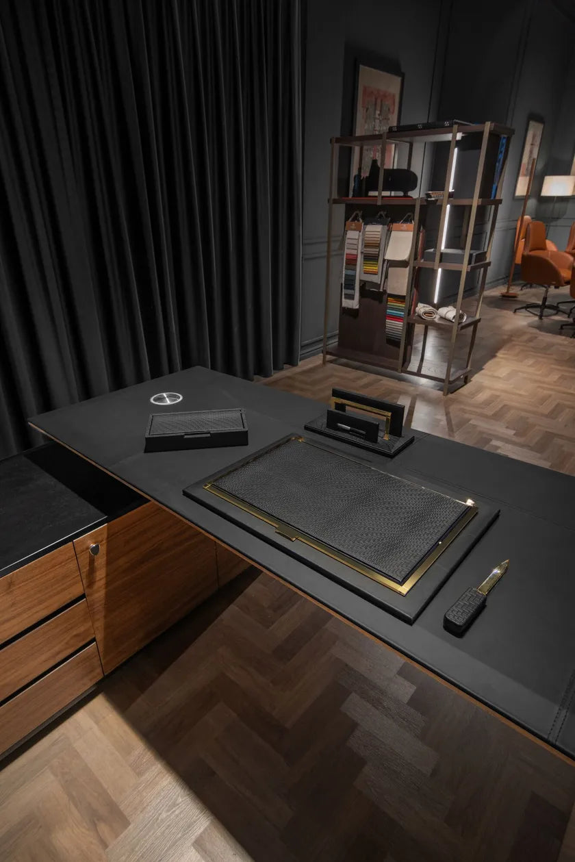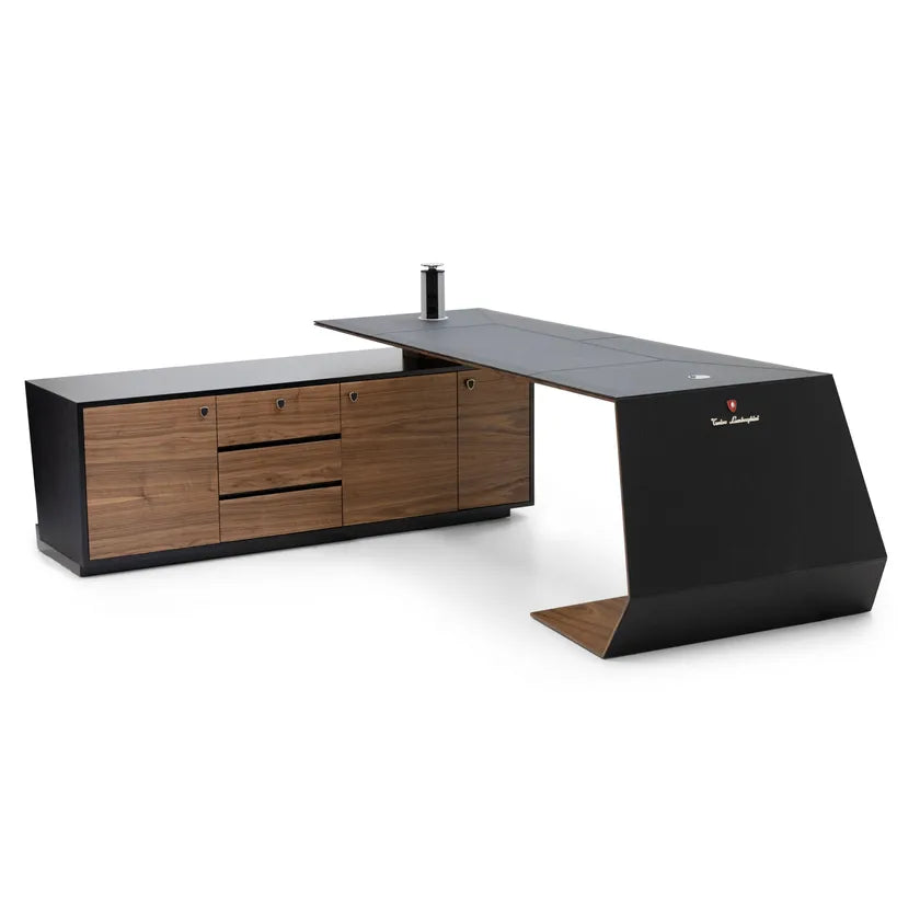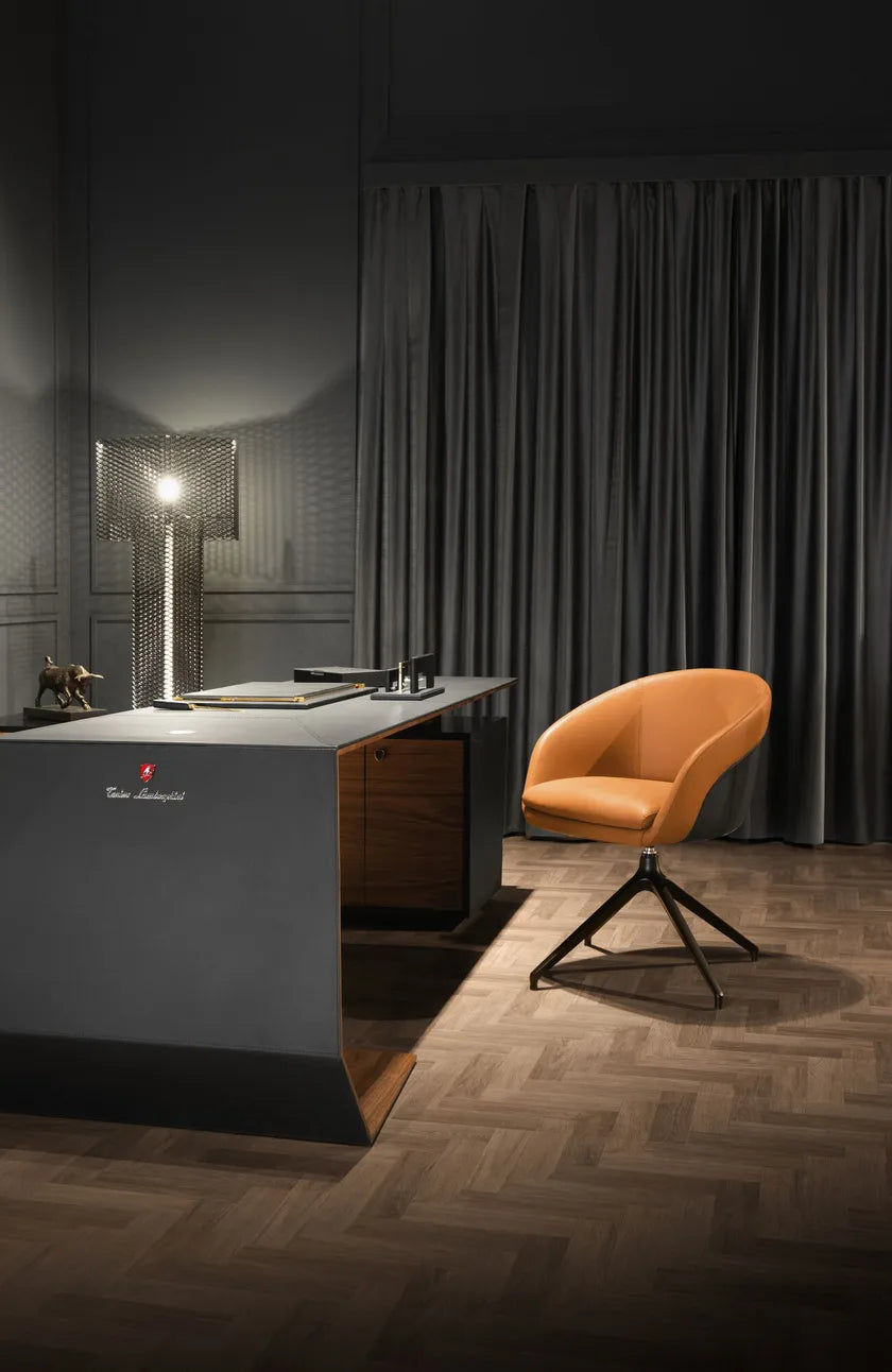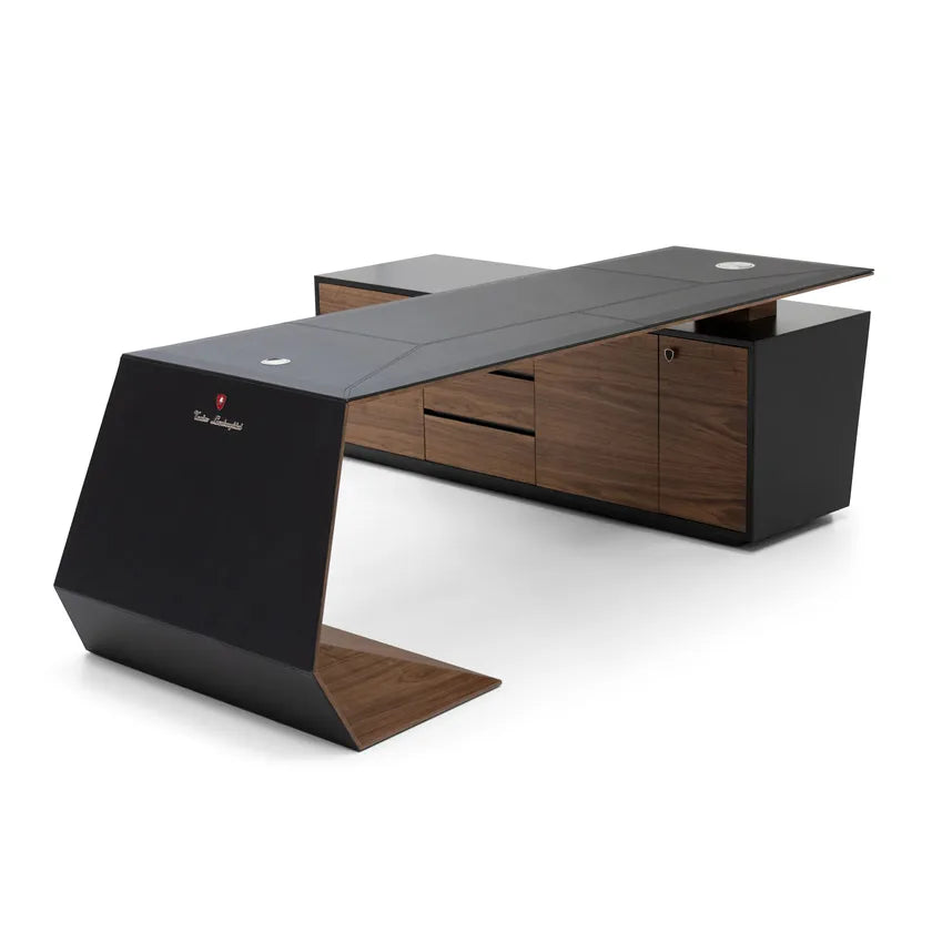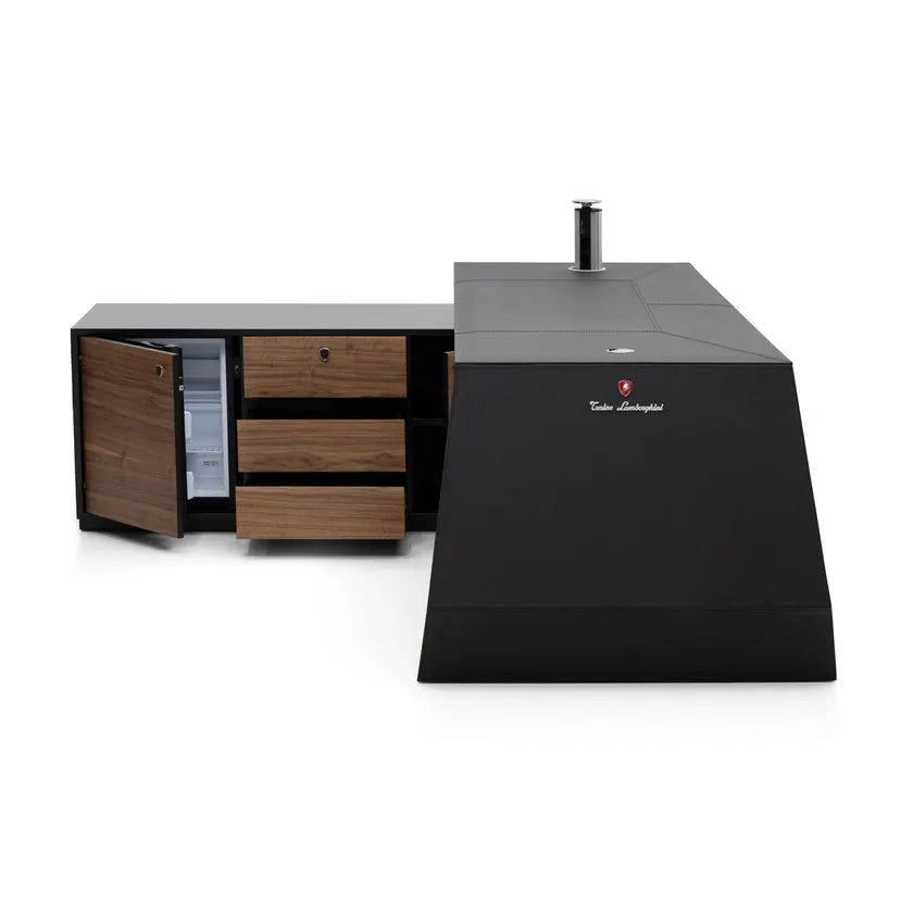 One of the most iconic pieces in the TONINO LAMBORGHINI Casa collection, the GT SUPERVENICE writing desk discovers a new harmony of materials. The Pure Black-colored Art. Cuoio leather of the top is elegantly matched with the warmth of the Venice veneer that lines the fronts of the side unit and the inside of the leg. Tone-on-tone decorative stitching enhance the top, and shield handles, finished in nickel with leather inserts, emphasize the attention to detail. The side unit, in addition to drawers and capacious spaces, can be accessorized with a small hidden refrigerator with personalized opening through a magnetic badge. The top, connected to the side unit by the metal column, is in perfect continuity with the side, decorated with the TL col. Nickel logo and the iconic red shield, and the base. Like the previous versions, the GT SUPERVENICE desk can be equipped with various optionals, multiplugs, cable grommets, mini-fridge with badge opening, safe deposit box.