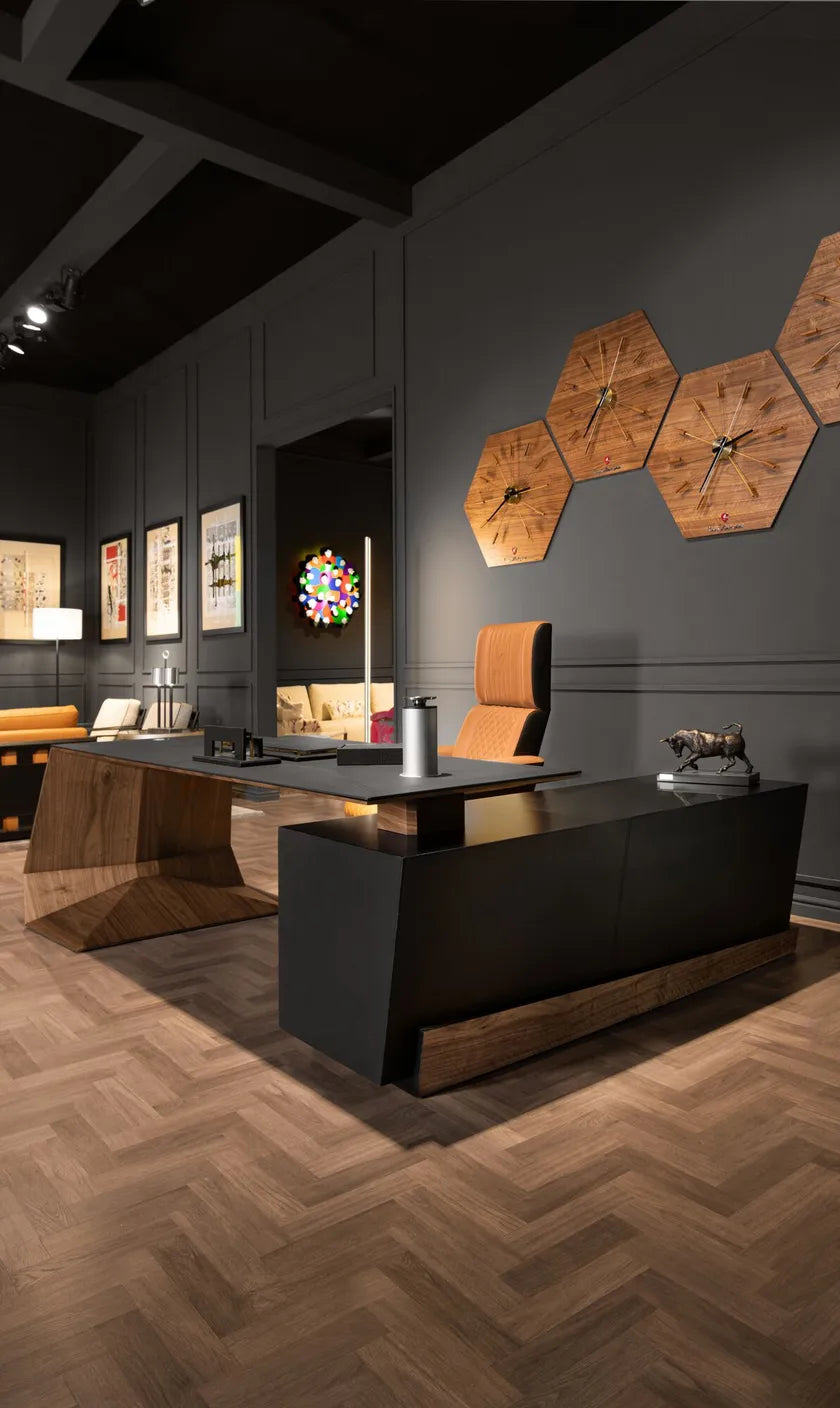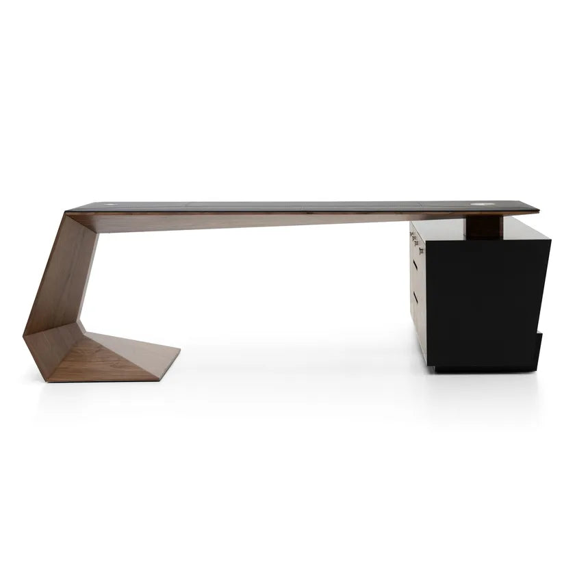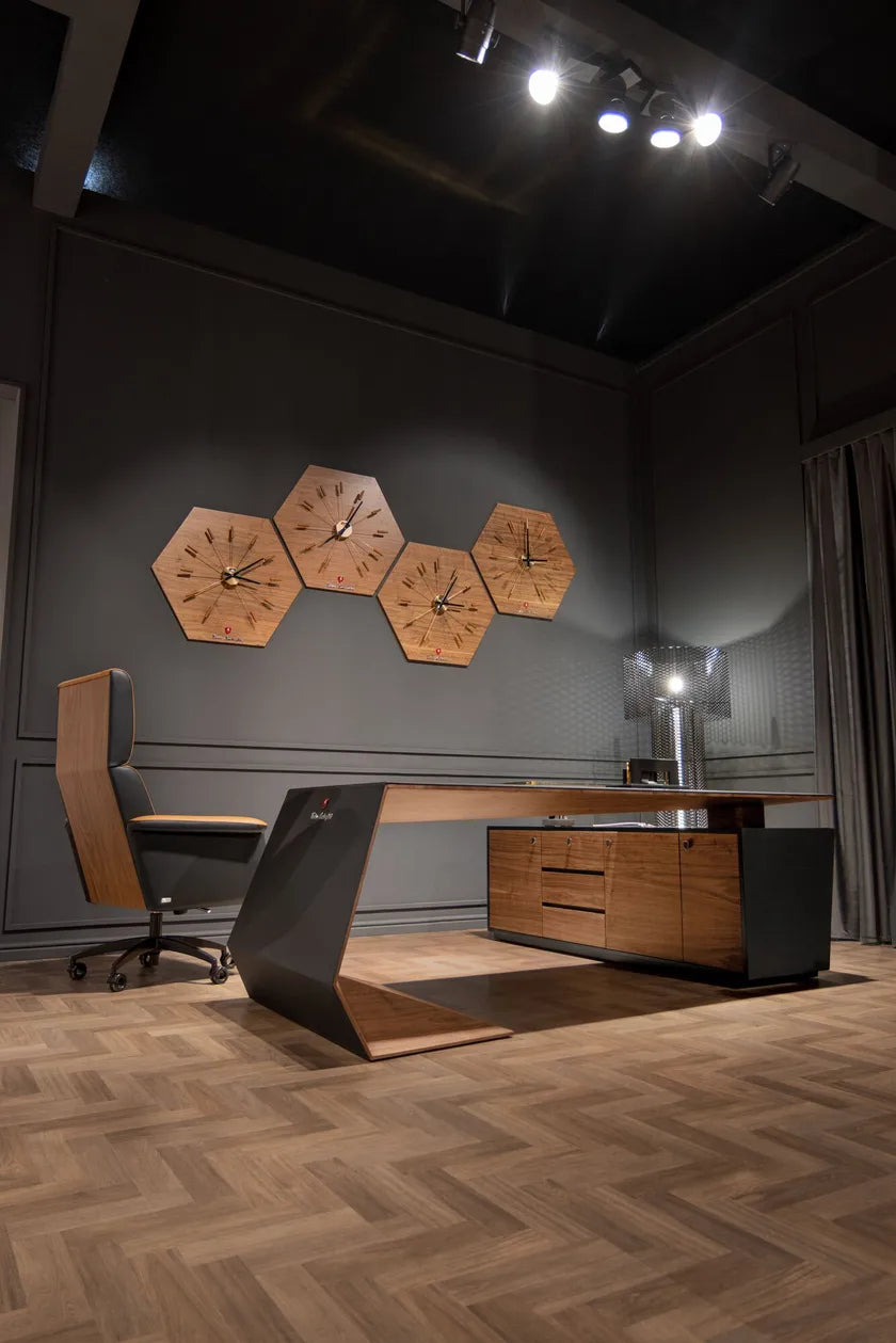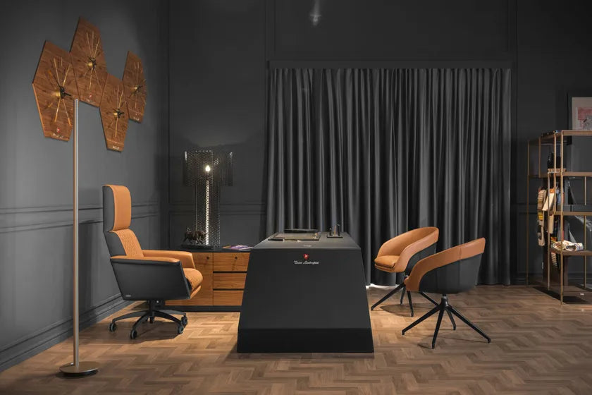 One of the most iconic pieces in the TONINO LAMBORGHINI Casa collection, the GT SUPERVENICE writing desk discovers a new harmony of materials. The Pure Black-colored Art. Cuoio leather of the top is elegantly matched with the warmth of the Venice veneer that lines the fronts of the side unit and the inside of the leg. Tone-on-tone decorative stitching enhance the top, and shield handles, finished in nickel with leather inserts, emphasize the attention to detail. The side unit, in addition to drawers and capacious spaces, can be accessorized with a small hidden refrigerator with personalized opening through a magnetic badge. The top, connected to the side unit by the metal column, is in perfect continuity with the side, decorated with the TL col. Nickel logo and the iconic red shield, and the base. Like the previous versions, the GT SUPERVENICE desk can be equipped with various optionals, multiplugs, cable grommets, mini-fridge with badge opening, safe deposit box.