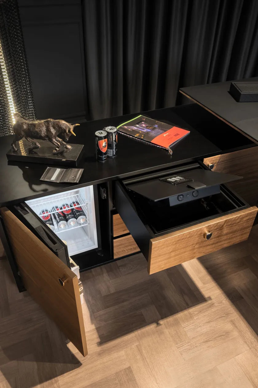 Accessories included: Multiplug, Cable Port, Built-in Fridge hidden in the Side Unit opening with personal badge, Safe Box opening with personal pin code.