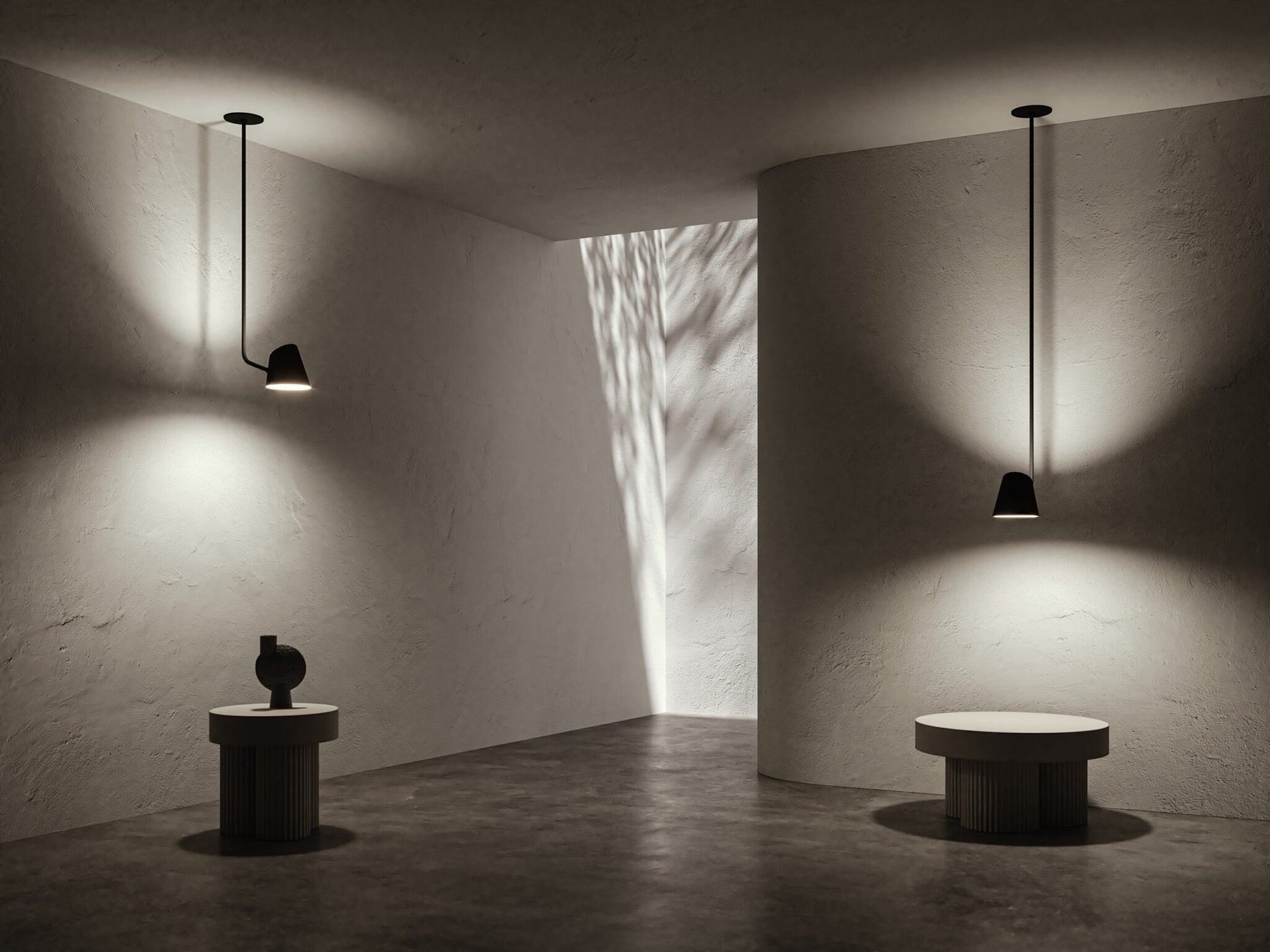 The lampshades are the signature of this collection. With their two openings, they offer both direct and indirect light to the wall or the ceiling. They accommodate a frosted glass tube that diffuses the light from a mini LED or Halogen bulb.