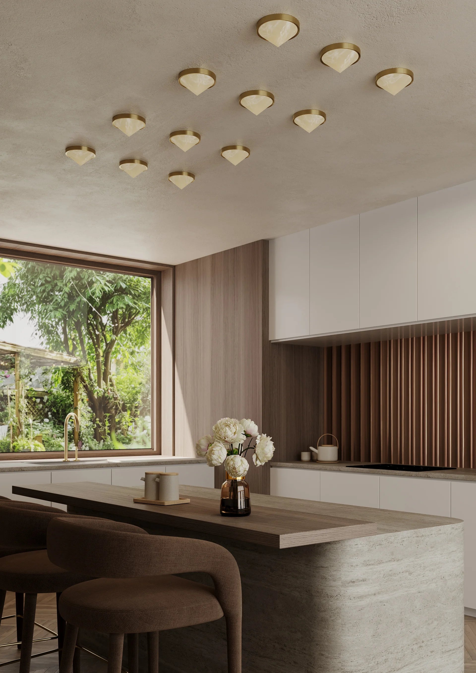 Prized for its unique natural veining, a single piece of carved alabaster creates the jewel-like shade of the miniature Colmar flush mount. This artistic stone can light replacement features a conical shade surrounded by a Vintage Brass border that lends a glimmering note of contrast. Colmar’s petite size and sleek profile make it a versatile choice for use alone or in multiples.