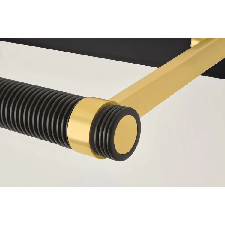 An industrial take on a classic picture light, Duell adds fine knurling to a clean-lined cylindrical shade. While the slender profile and streamlined backplate allow Duell to blend into any space, the oversized brackets and rectangular armbacks introduce architectural interest. Duell is available in three sizes and two finish options: an all-over Aged Brass or Distressed Bronze with Aged Brass accents.