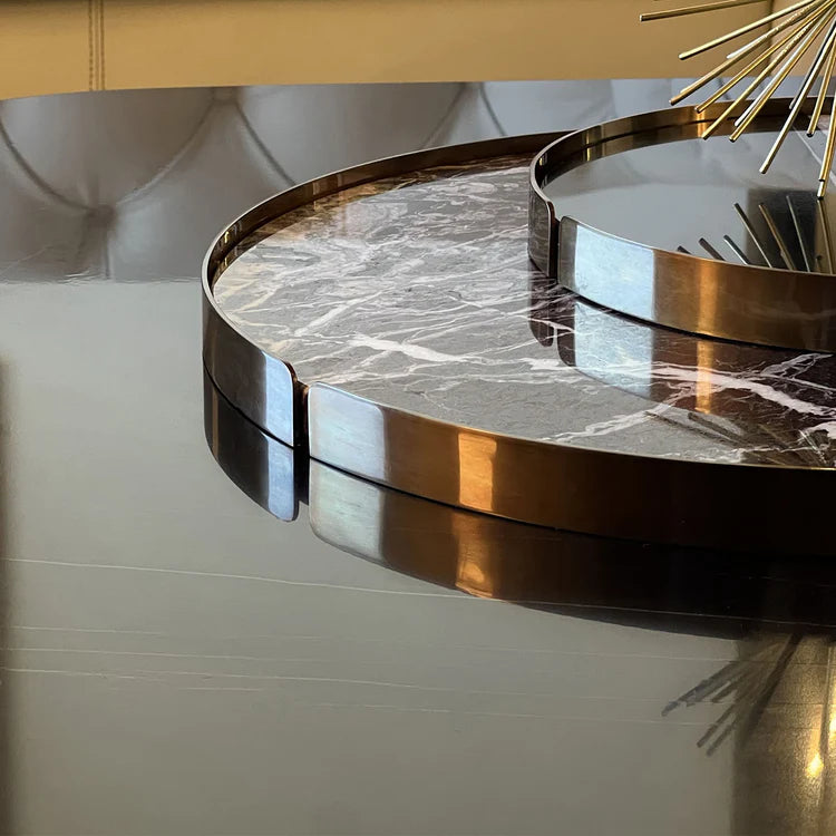 The Hug tray with frame features a circular marble surface enclosed by an elegant brass border adorned with delicate, refined engravings. Available in various finishes, this piece balances functionality with sophisticated aesthetics, making it ideal for both residential and commercial spaces. The product shown in the photo features a burnished bronze metal frame and a Red Levanto marble top. For customization requests or alternative finishes tailored to specific project needs, please contact the Concierge. Designed by Carlo Bimbi, it perfectly combines elegance and versatility.
