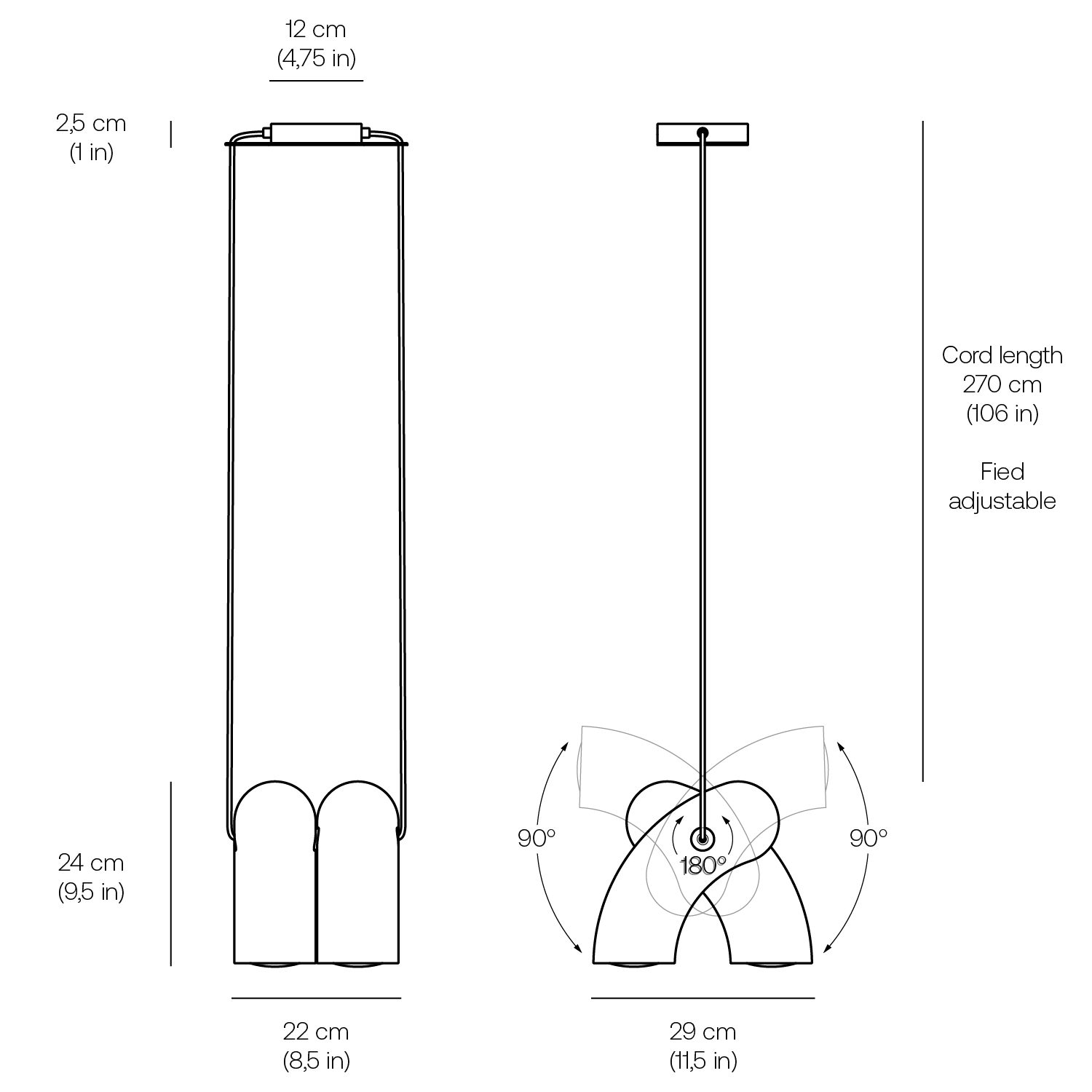 Hanging, the Hyphen collection’s two cylindrical bodies are joined by a pivot that offers several light positions and orientations projecting a