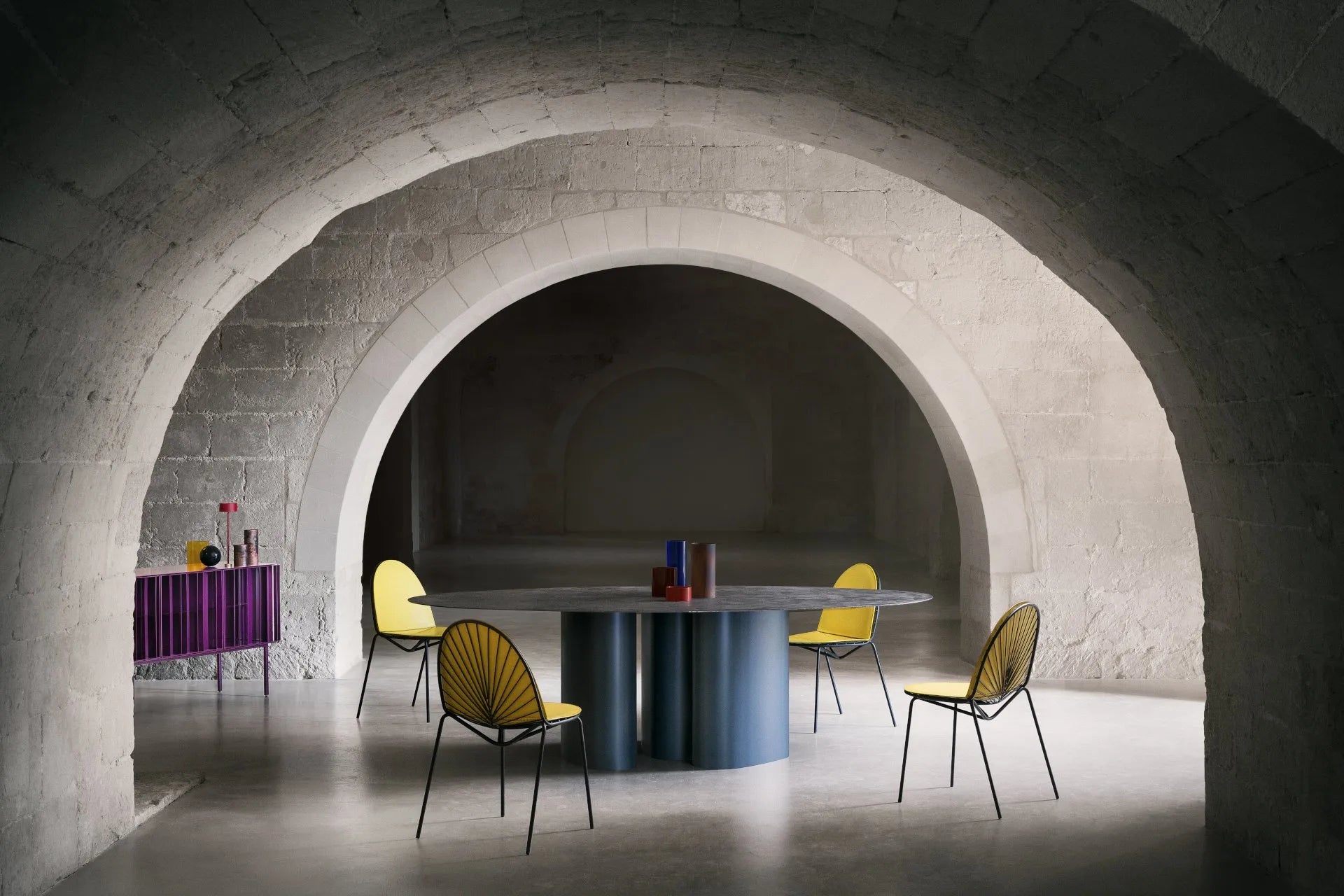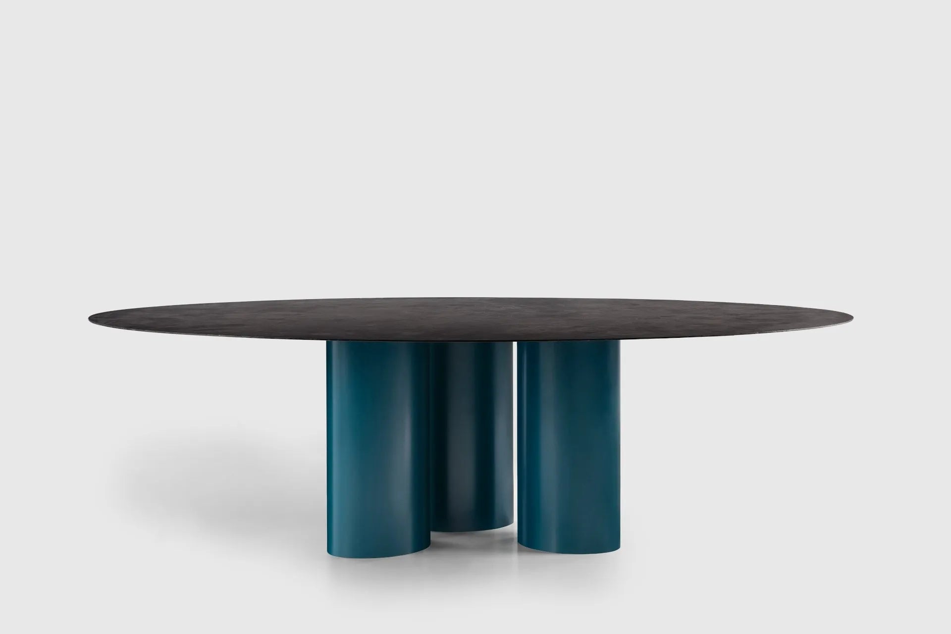 Indoor-outdoor oval table, elongated and curved cylindrical legs, available with steel top or with other tops of the DAA collection