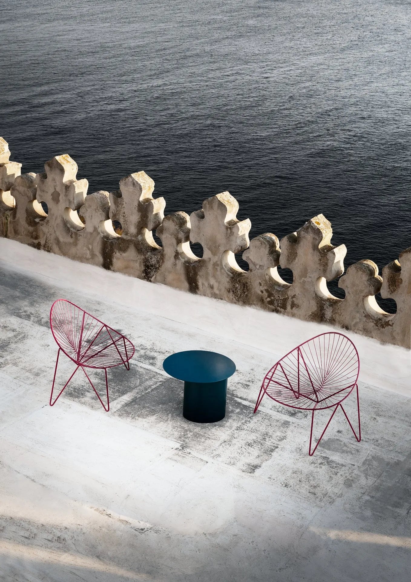 Indoor-outdoor coffee table, elongated and curved cylindrical base, steel top