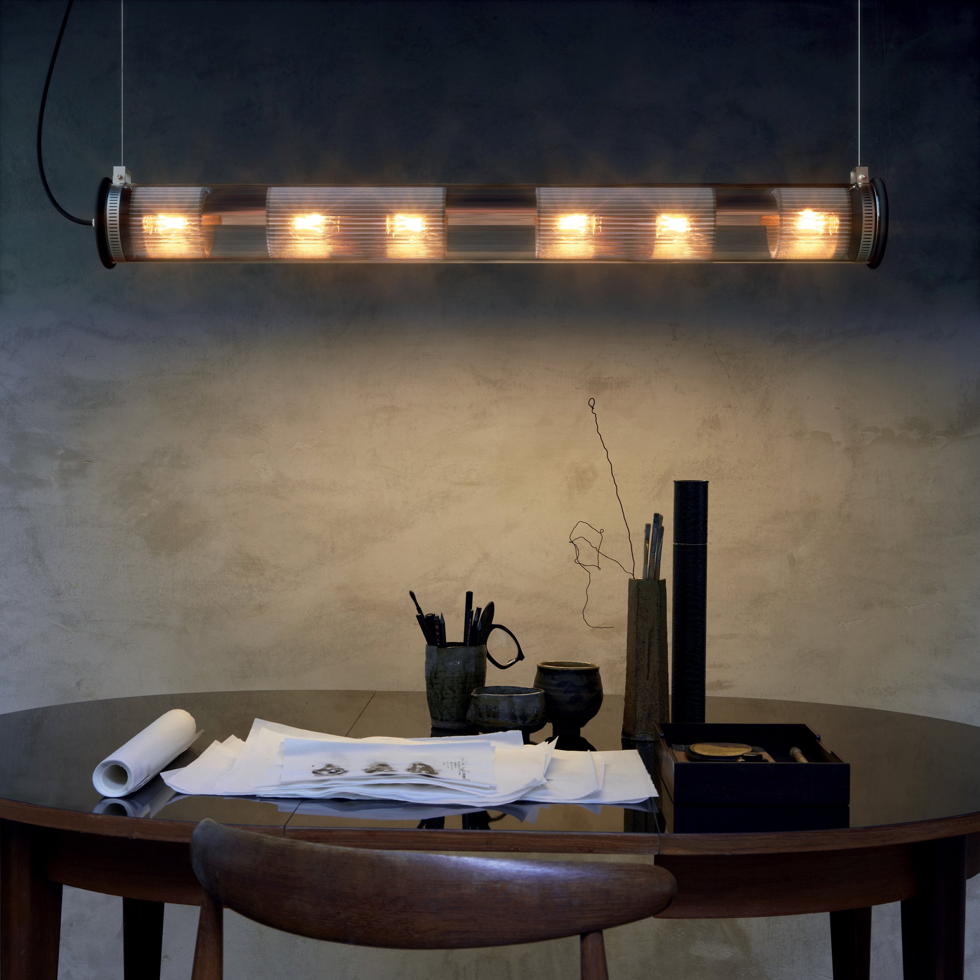 The In The Tube Horizontal Silver Pendant brings ideas that are both free and constrained, making this perfect in a variety of interior spaces. Borosilicate glass cylinders are complemented by a removable mesh accent to create an interesting piece both lit and unlit. Stoppers on either end complete the look. Available in three sizes. Canopy: 4.6 inch diameter.