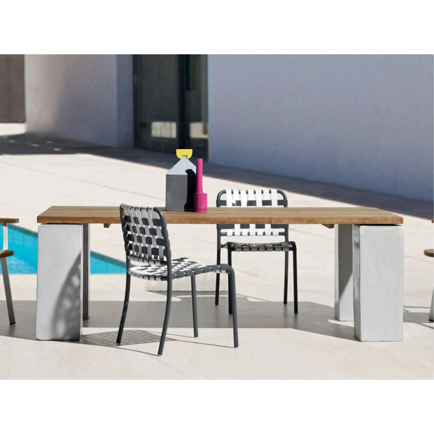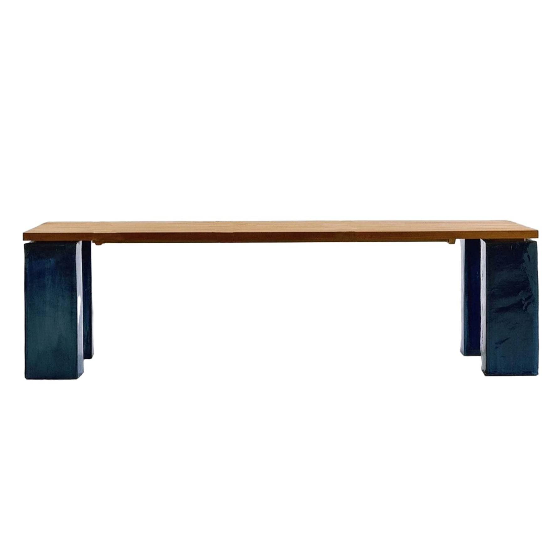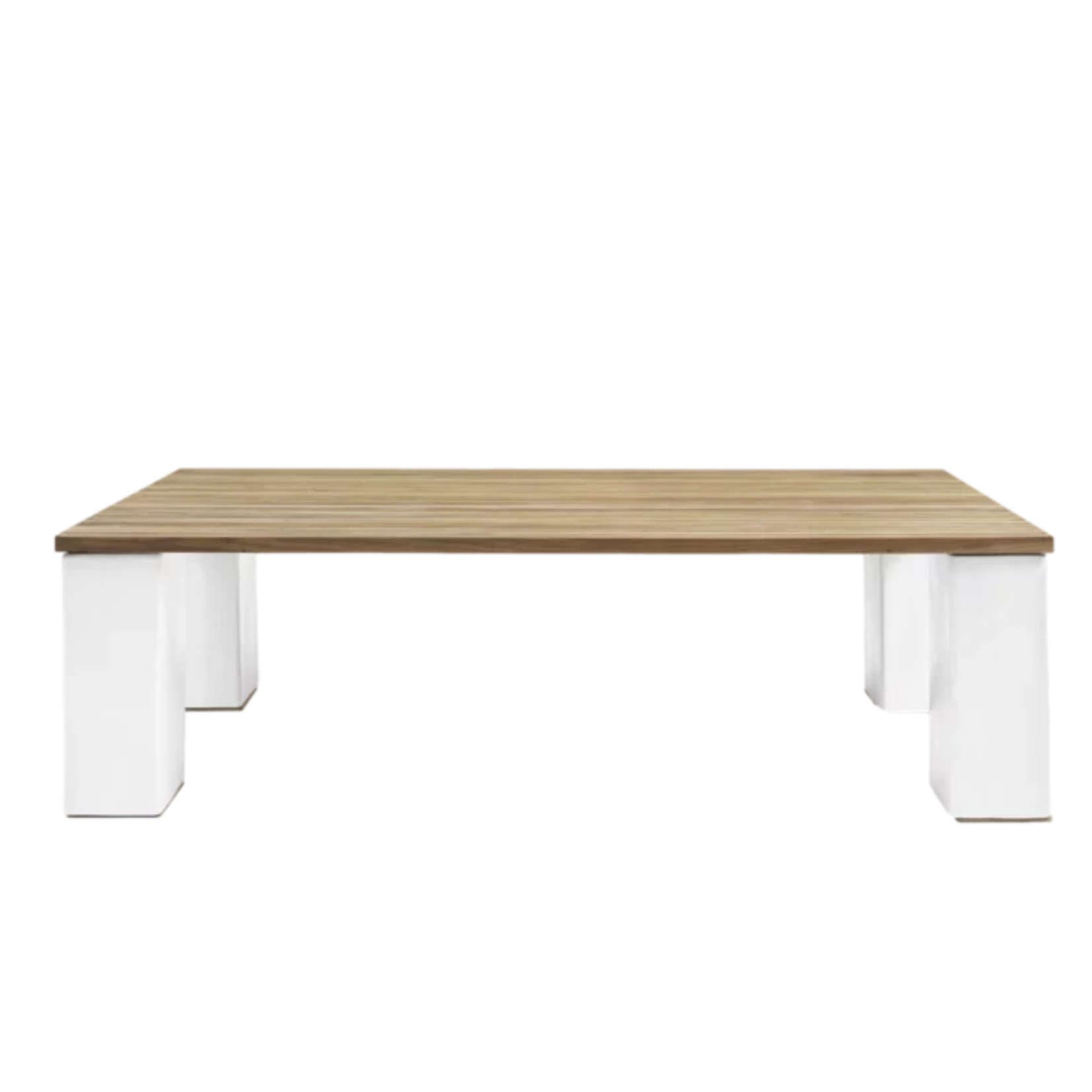 Family of tables born from the union of natural and latest generation materials, Inout 33/34/35/39 are available in different sizes: with rectangular or square tops of various sizes. They are made with a top in natural teak slats and legs in blue, white or anthracite grey ceramic, rectangular or trapezoidal in shape. In addition, the tables with rectangular top, having larger dimensions, also have a steel supporting structure. Table with natural teak slats top; blue, white or anthracite grey ceramic feet with steel structure.