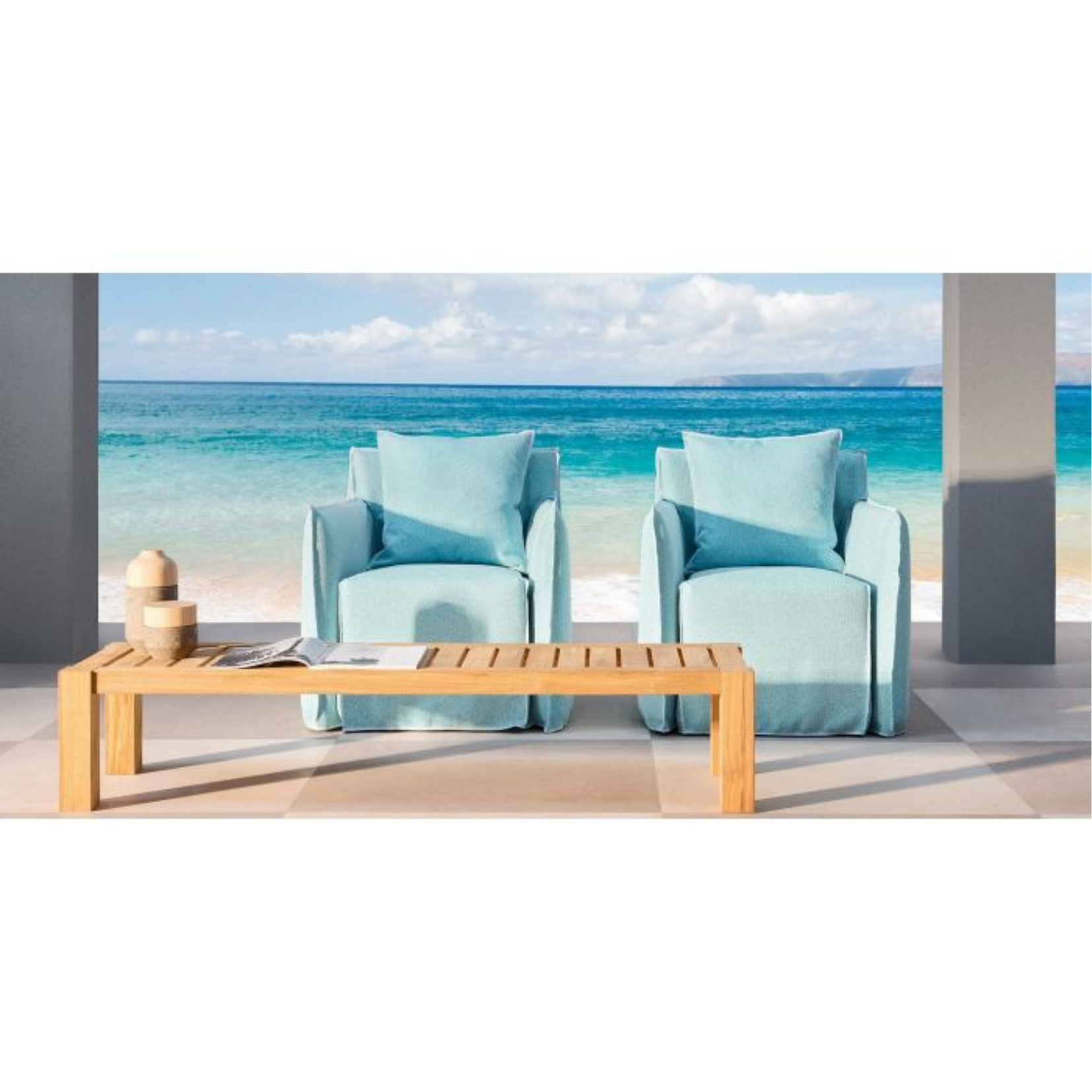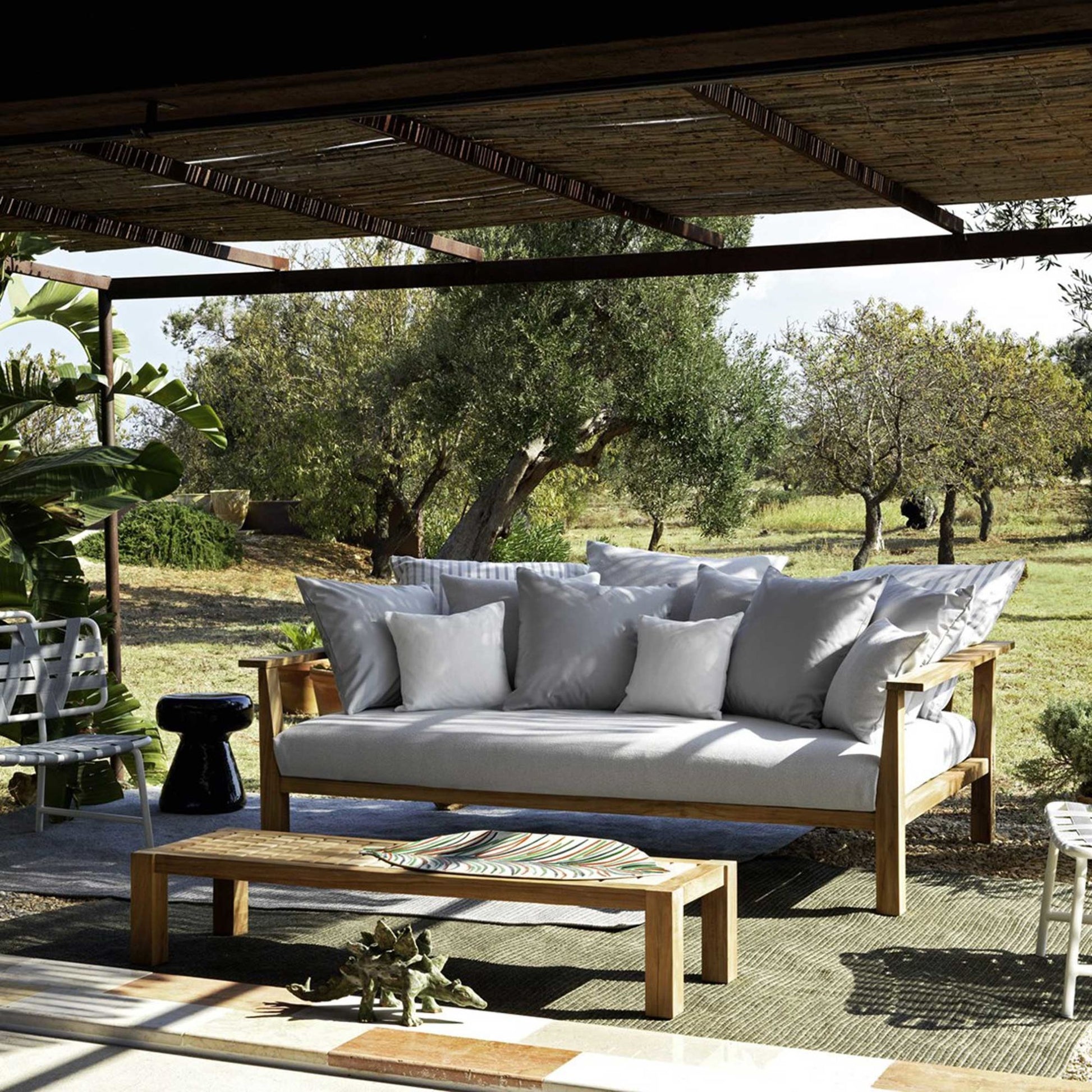 Materials playing off one another define the Inout 14 coffee table: the structure made of natural teak, recycled material and coming from the reuse of teak beams, perfect for resisting the elements, is available with the removable top surface made of teak slats or white Carrara marble, giving life to a versatile product with a clean and minimal aesthetic, of sophisticated minimalism. Coffee table in natural teak, removable slats top.