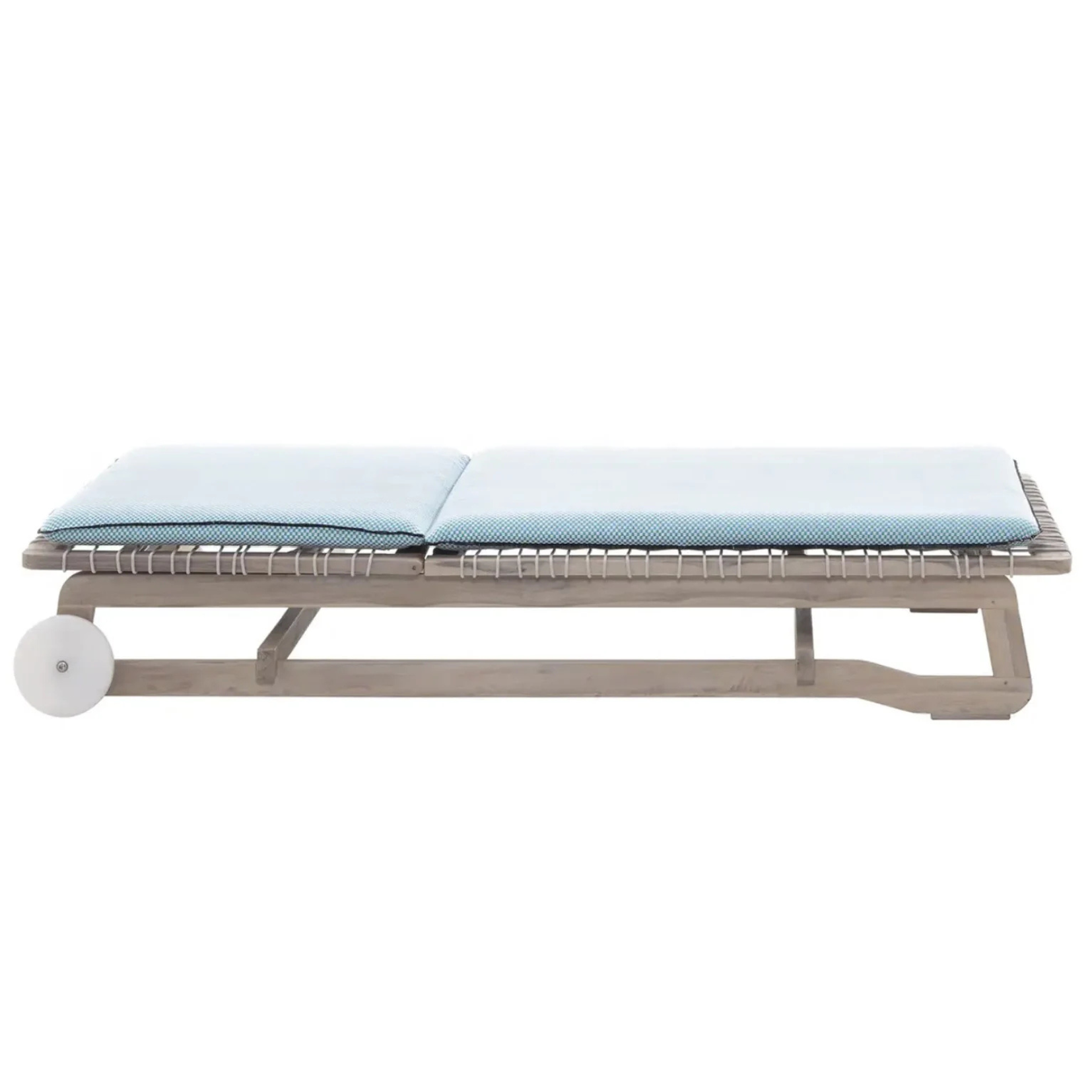 The Inout 869 cot is characterised by a reclining structure that combines the structure in Washed Teak, one of the finest tropical woods subjected to ageing treatment that determines the particular shade of grey of the surface, with a particular mesh weave in high-intensity polyethylene rope, which gives the product a handcrafted charm. In addition, for accentuated comfort, a mattress with removable upholstery. Day bed, Washed Teak frame woven with grey HDPE, two castors in Teflon, adjustable back, mattress 80 x 200 cm with removable cover.