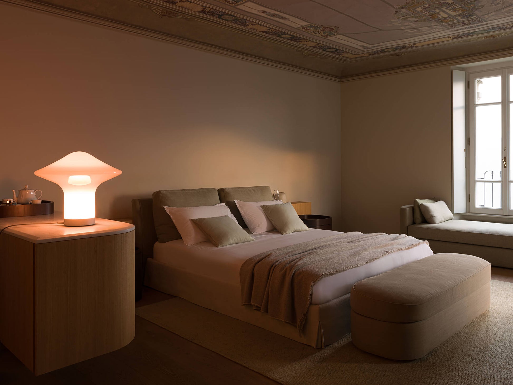 Trottola is a collection of suspension and table lights whose shape elicits memories of a popular childhood toy – the spinning top. The aesthetics of the design are carried on an enchanting luminance that passes through an opal diffusor and opaline glass to reveal a playful contrast of shadows and light. The LED source is housed in a base clad in pressed aluminium, which in turn is finished in an attractive black or silver anodized. Brightness and light temperature can be adjusted with a simple turn of the elegant dimmer by the table versions of the collection. Trottola offers two sizes of suspension and table lights in handblown opaline glass. The table variant is fitted with the innovative BROKIS connector, which makes it easy to disconnect the light and move it about the interior and also facilitates disassembly for maintenance and cleaning. As if by magic, the semi-transparent object comes to life with a gentle glow to reveal a fascinating playscape of shapes and shadows in the interior.