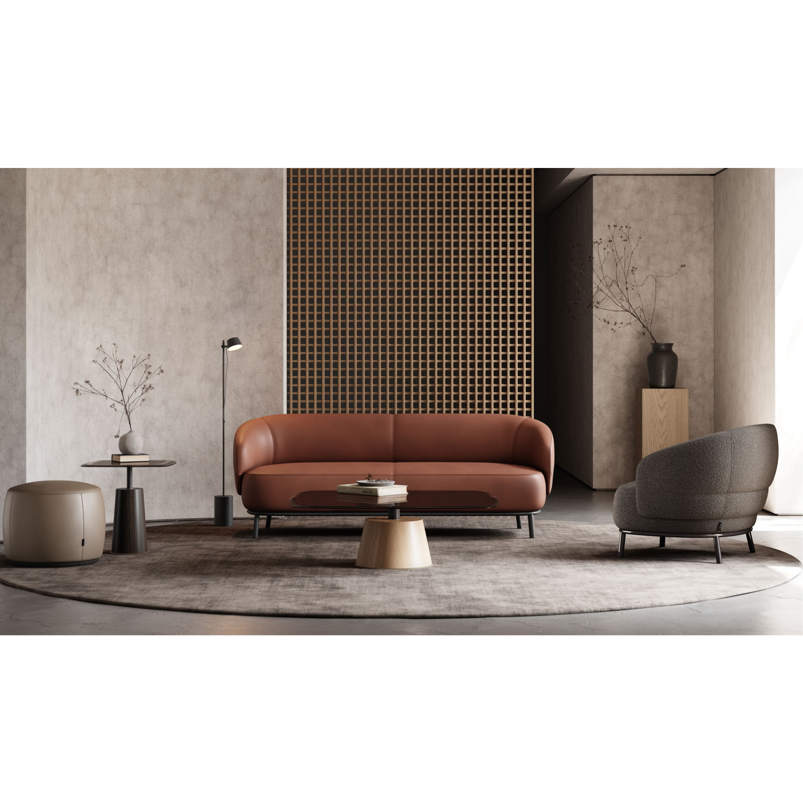 Defined by its soft curves and balanced proportions, the backrest extends gracefully to the sides, forming subtle and elegant armrests.