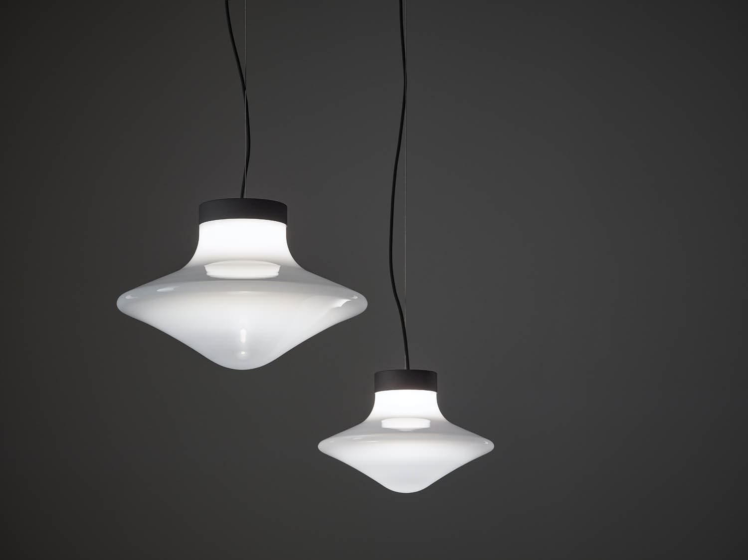 Trottola is a collection of suspension and table lights whose shape elicits memories of a popular childhood toy – the spinning top. The aesthetics of the design are carried on an enchanting luminance that passes through an opal diffusor and opaline glass to reveal a playful contrast of shadows and light. The LED source is housed in a base clad in pressed aluminium, which in turn is finished in an attractive black or silver anodized. Brightness and light temperature can be adjusted with a simple turn of the elegant dimmer by the table versions of the collection. Trottola offers two sizes of suspension and table lights in handblown opaline glass. The table variant is fitted with the innovative BROKIS connector, which makes it easy to disconnect the light and move it about the interior and also facilitates disassembly for maintenance and cleaning. As if by magic, the semi-transparent object comes to life with a gentle glow to reveal a fascinating playscape of shapes and shadows in the interior.