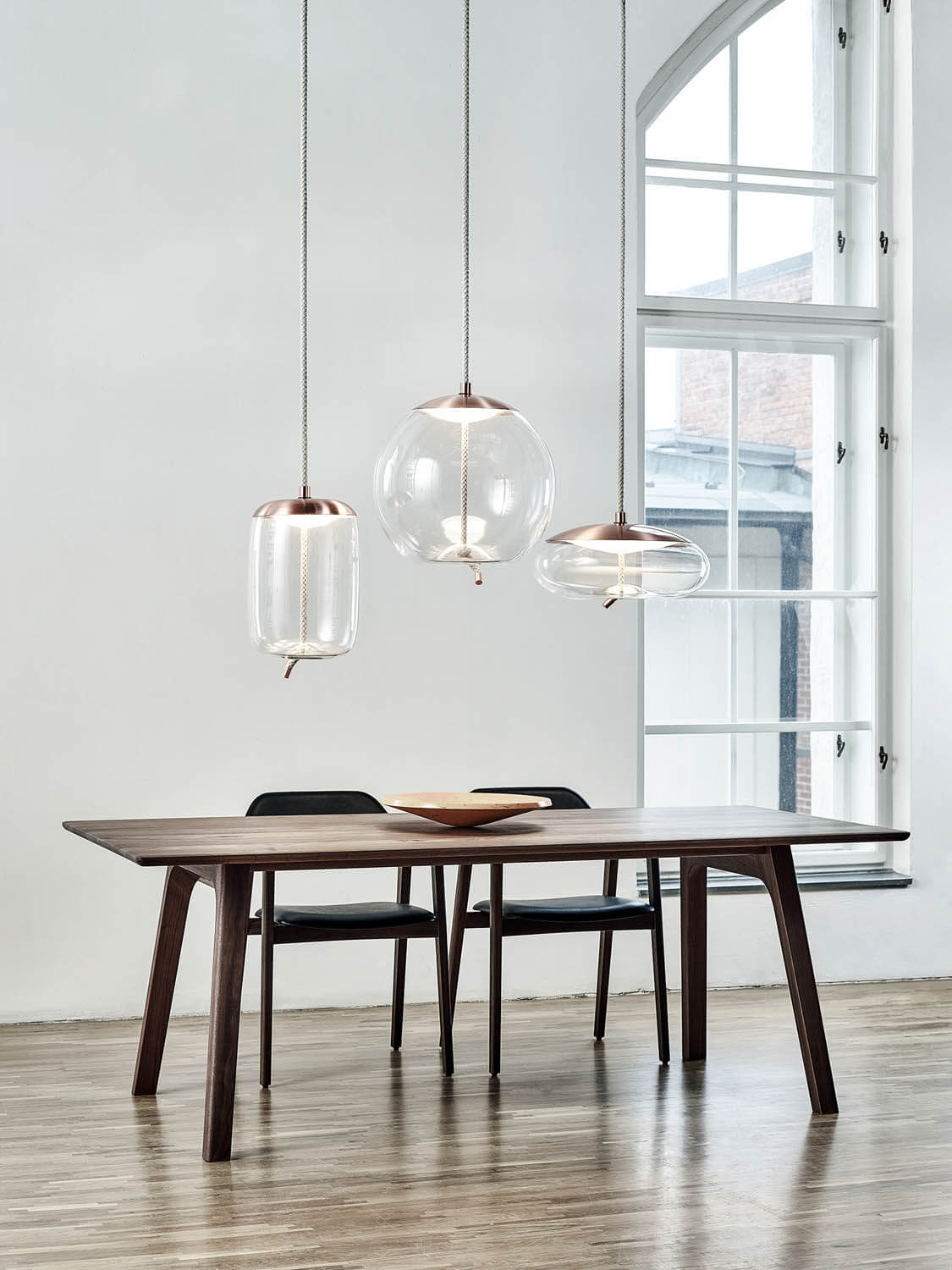 The LED light source is housed in a handsome top hood, which, like the cord end cap, is fashioned in refined metal. Knot is well-suited to both private and public interior spaces and makes a particularly impressive statement above dining tables.