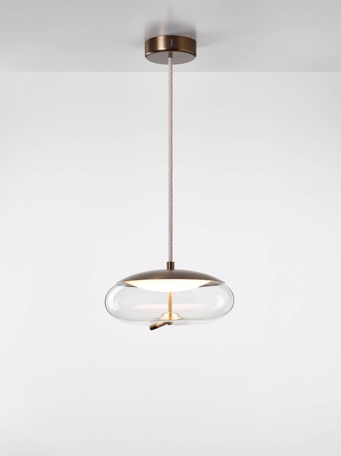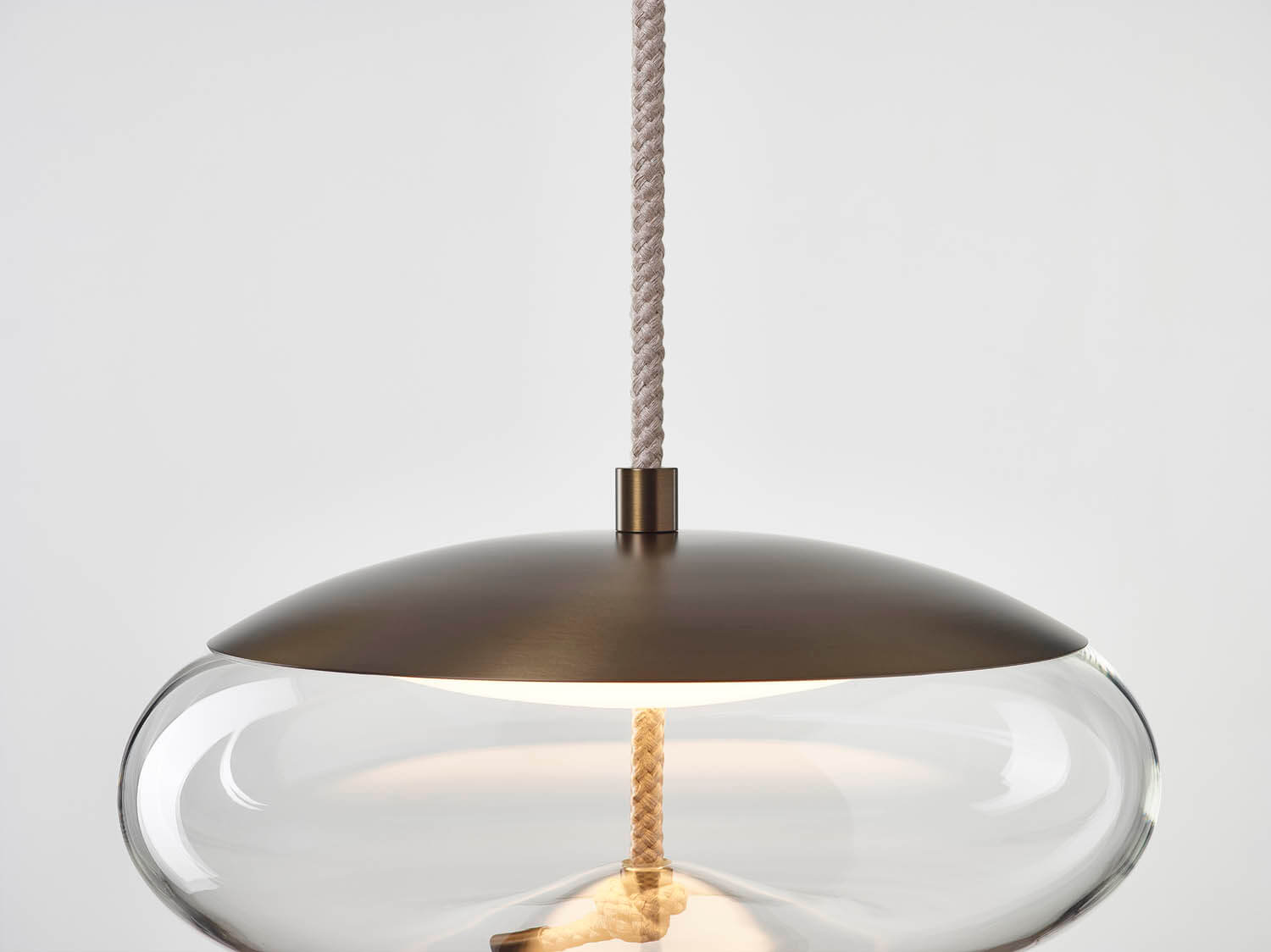 Knot Disco Pendant is a stately fixture that combines coarse natural fiber with smooth, transparent blown glass creating a contrast as striking as it is dignified. A flattened glass globe is penetrated by a robust cord that seemingly pulls the bottom of the glass inward for a bemusing plastic effect.