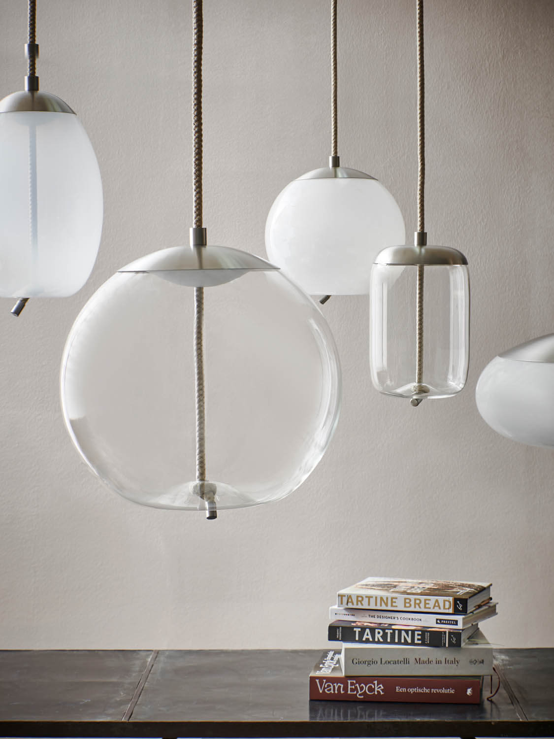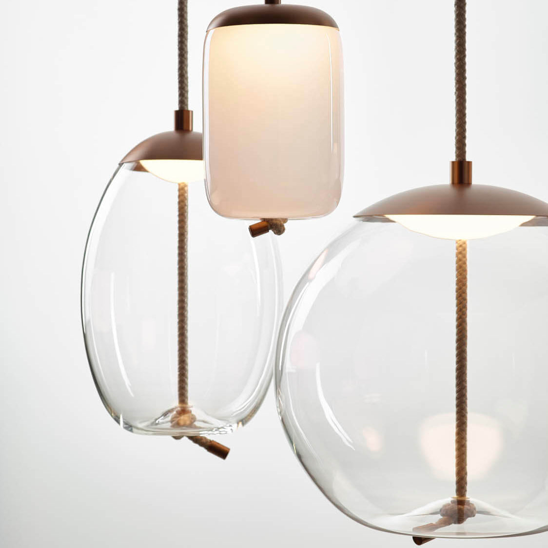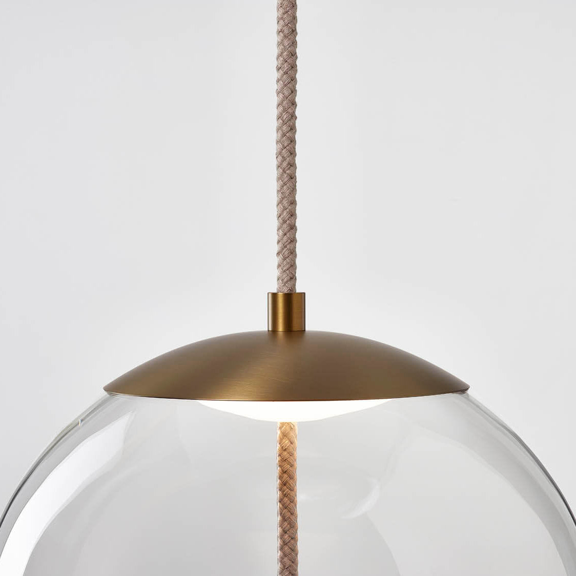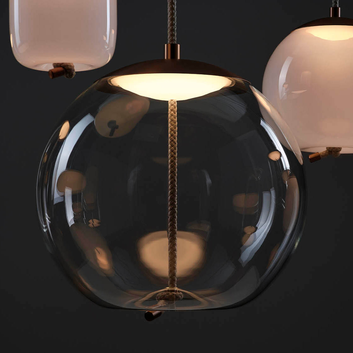 Knot Sfera Pendant is a stately fixture that combines coarse natural fiber with smooth, transparent blown glass creating a contrast as striking as it is dignified. A glass globe is penetrated by a robust cord that seemingly pulls the bottom of the glass inward for a bemusing plastic effect.