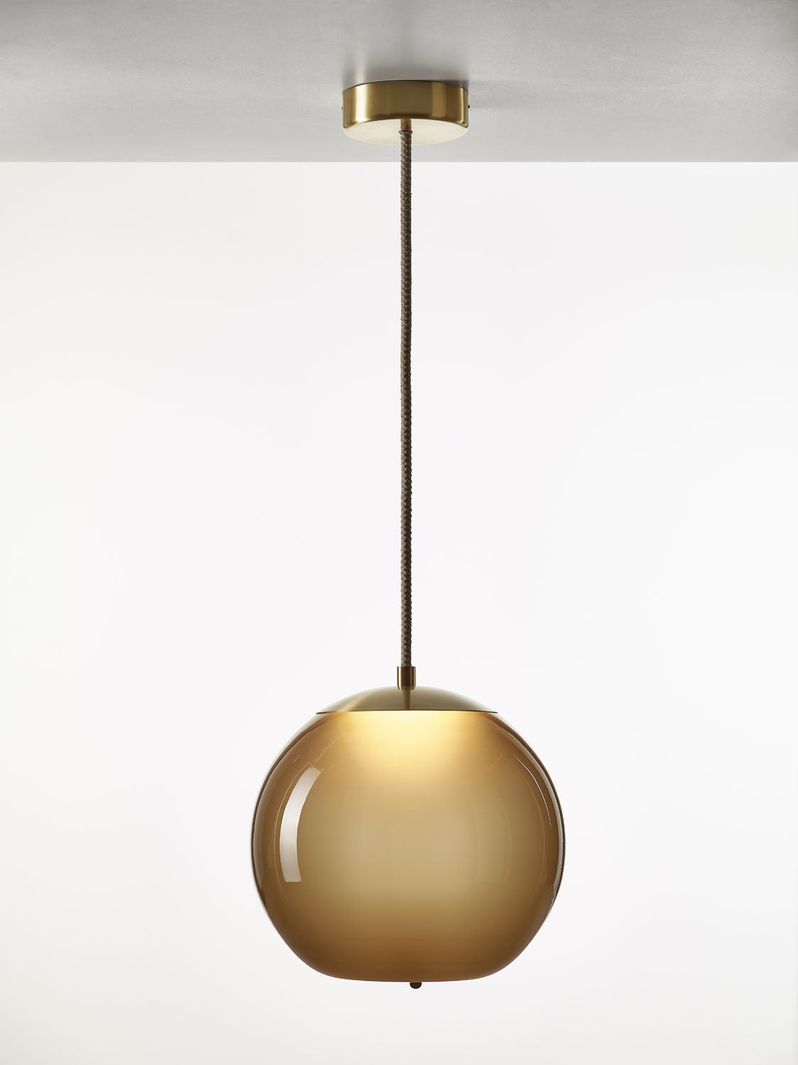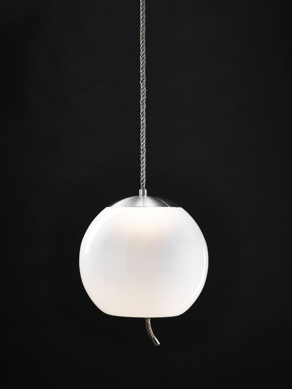 The LED light source is housed in a handsome top hood, which, like the cord end cap, is fashioned in refined metal. Knot is well-suited to both private and public interior spaces and makes a particularly impressive statement above dining tables.