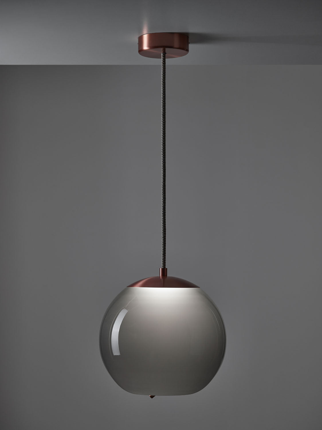 Available in two sizes with a Copper, Chrome Black, Brushed Stainless Steel, or Brass finish with matching canopy, and a Smoke Grey, Smoke Brown, Transparent Opaline, or Transparent glass shade.