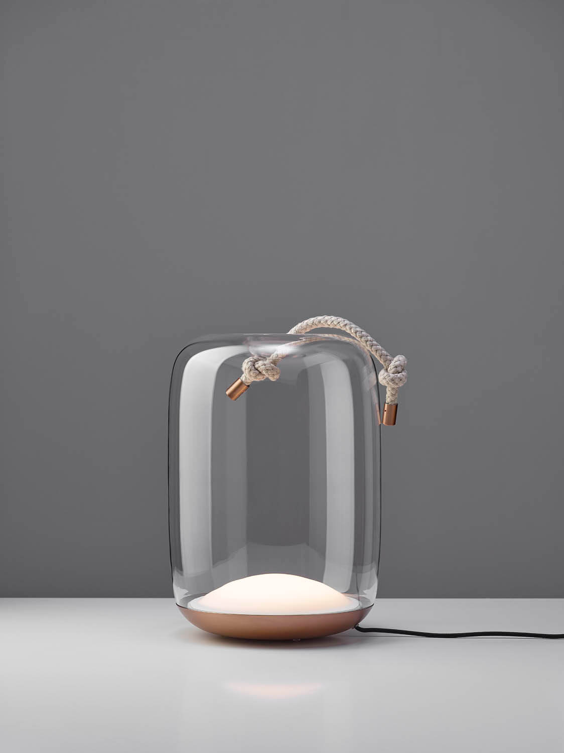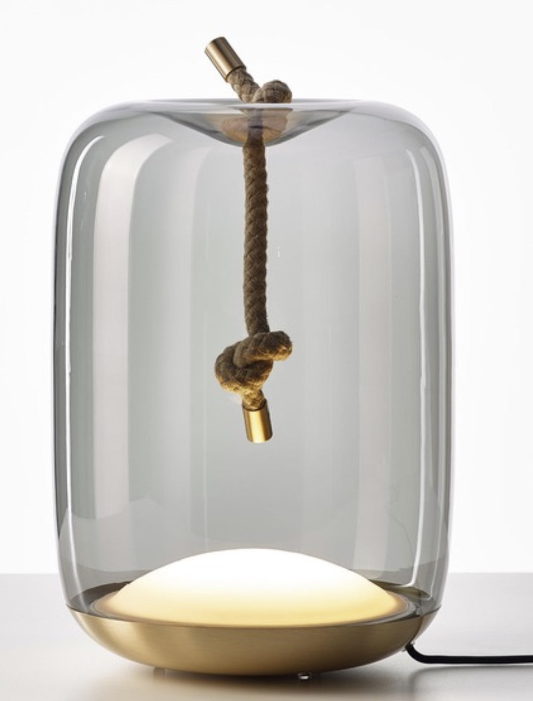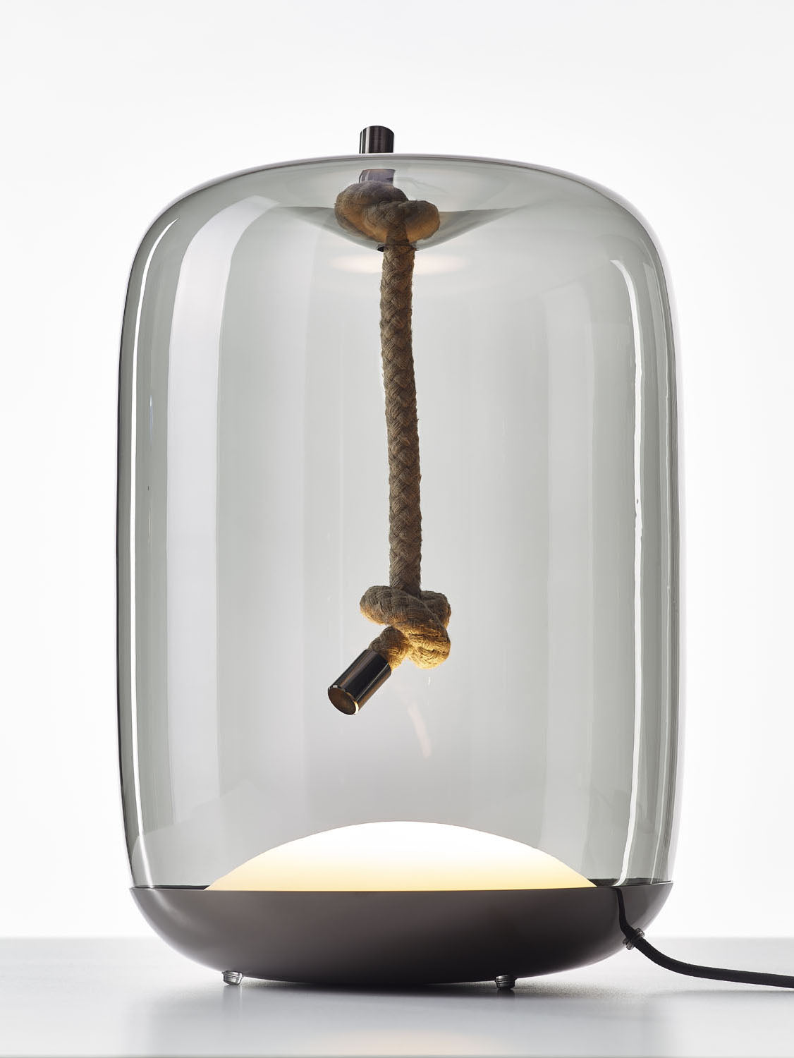 The Knot Table Lamp combines coarse natural fibers with smooth glass to create a striking contrast. An LED light source is housed in a refined metal base. Available in Transparent Smoke Grey, Transparent Smoke Brown, Opaline, or Transparent glass with a Chrome, Brass, Brushed Stainless, or Black Chrome base.