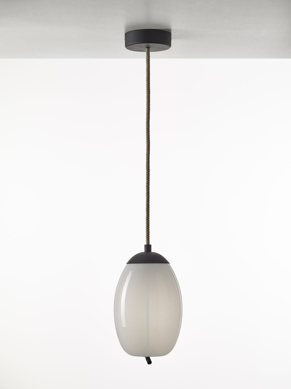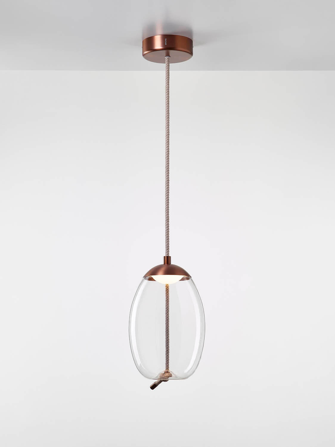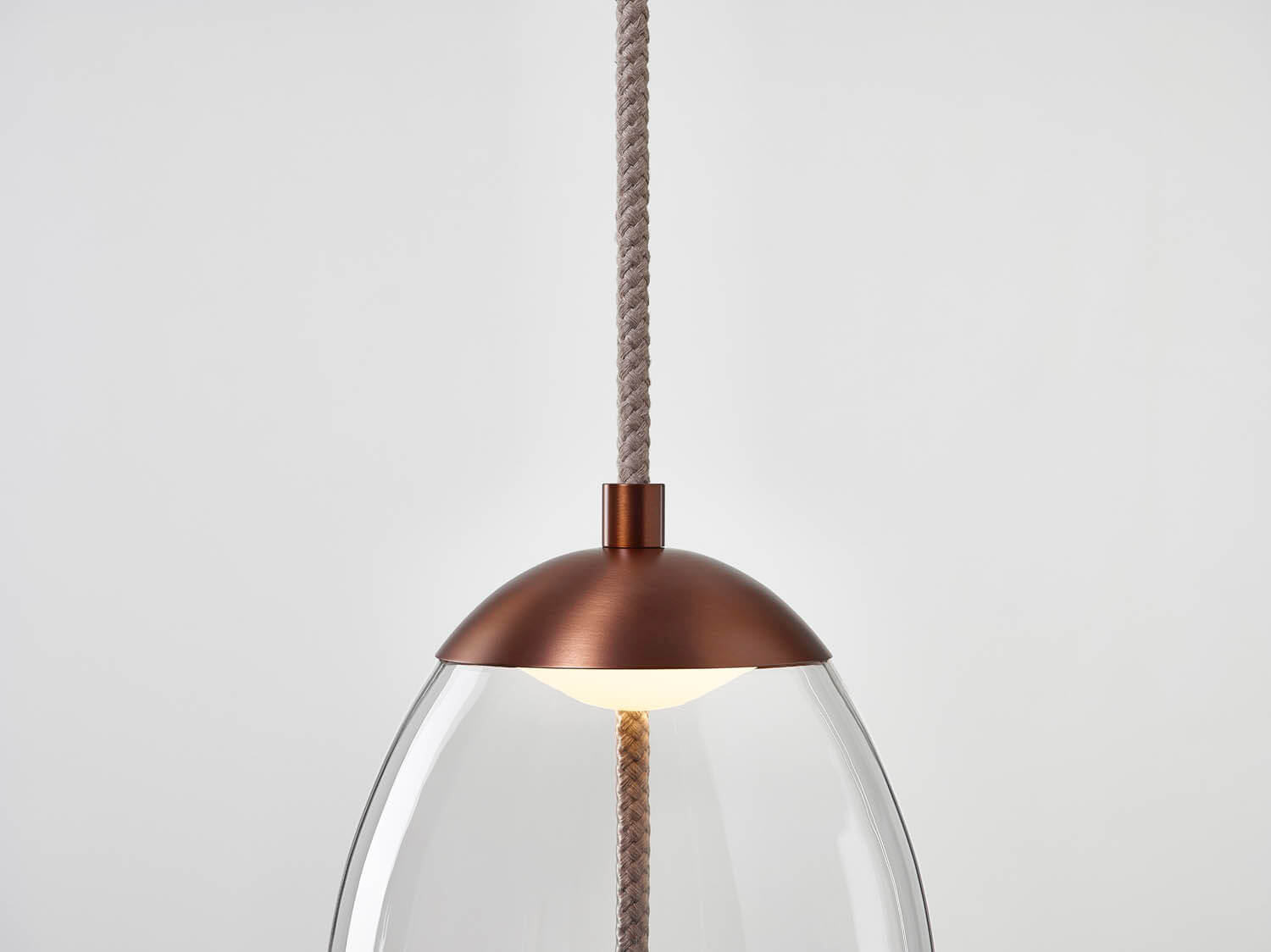 The LED light source is housed in a handsome top hood, which, like the cord end cap, is fashioned in refined metal. Knot is well-suited to both private and public interior spaces and makes a particularly impressive statement above dining tables.