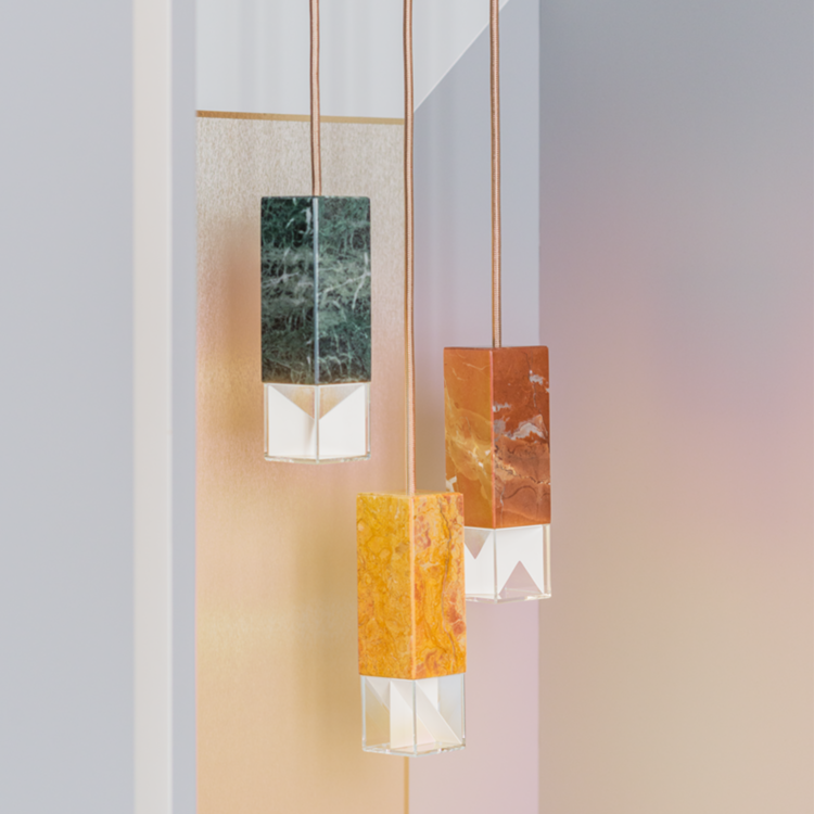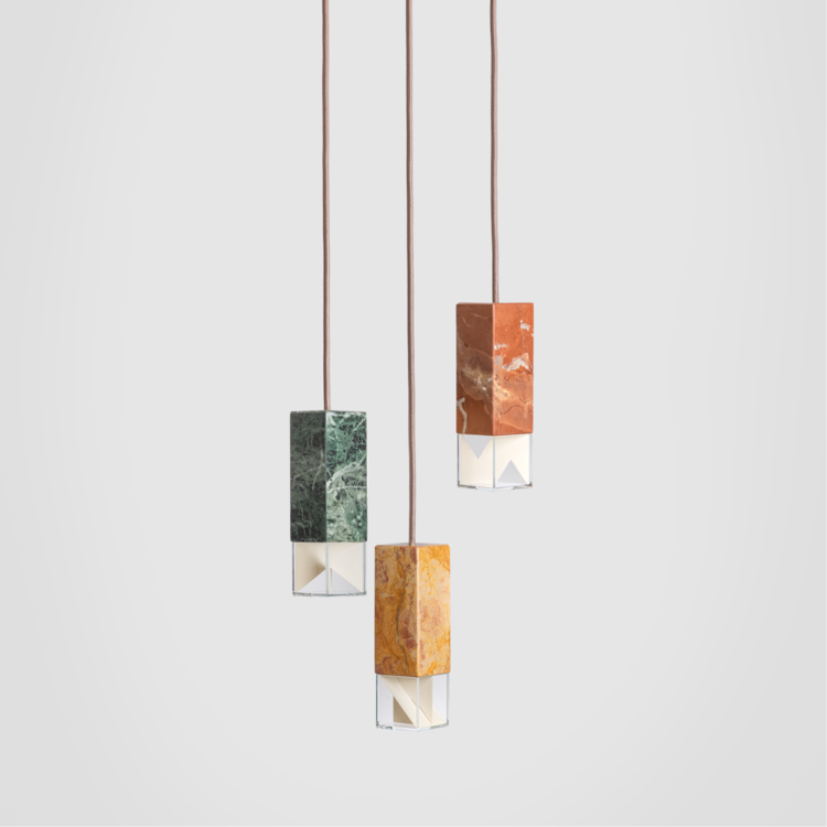 This 3-Light Chandelier exalts prized local materials and traditional techniques such as marble carving, crystal grinding and porcelain mould-production. This exclusive selection of Italian marbles, Red Collemandina, Green Alpi, Royal Pink Yellow, create an elegant composition, completed by crystal shades and Limoges porcelain sheets, irradiating a warm downlight.