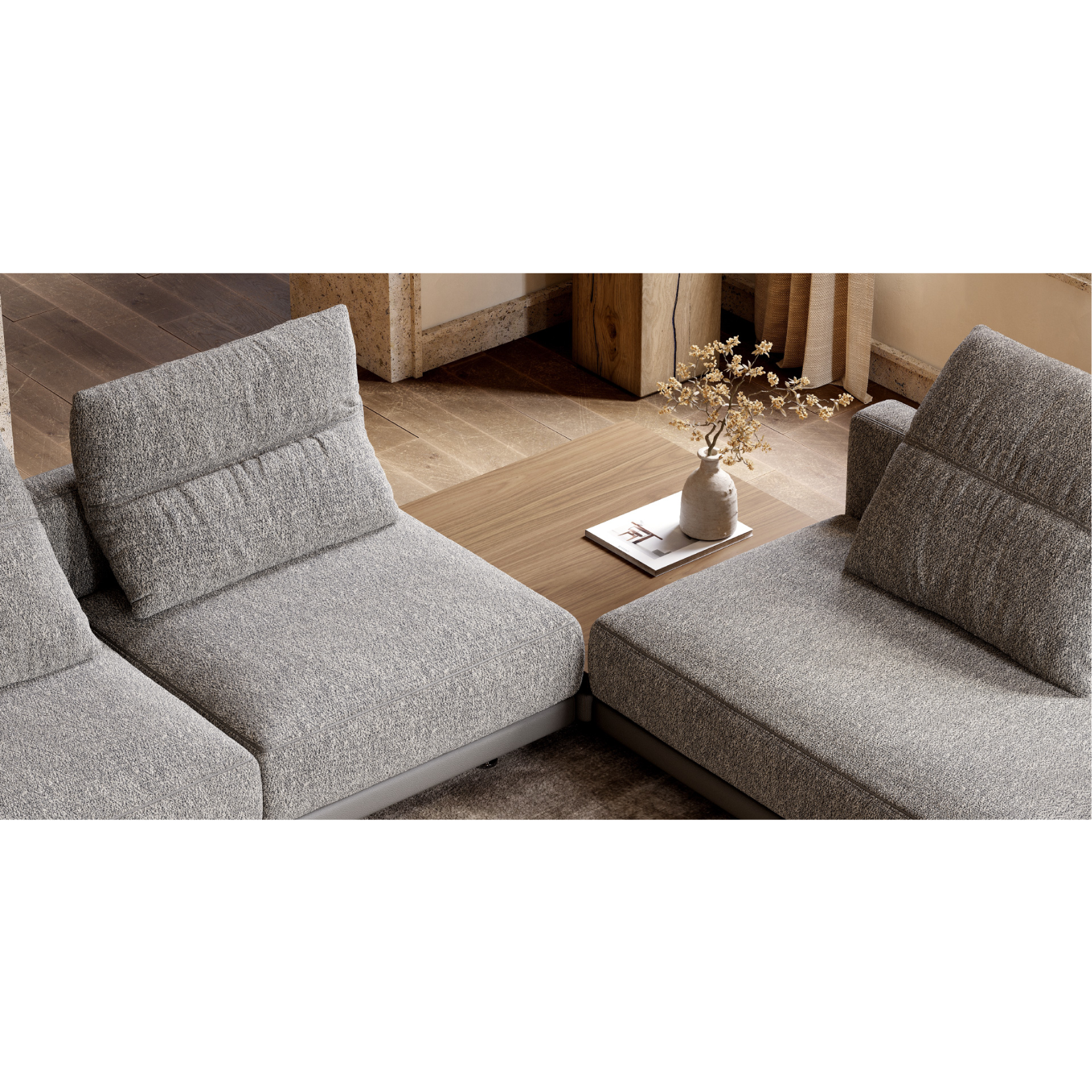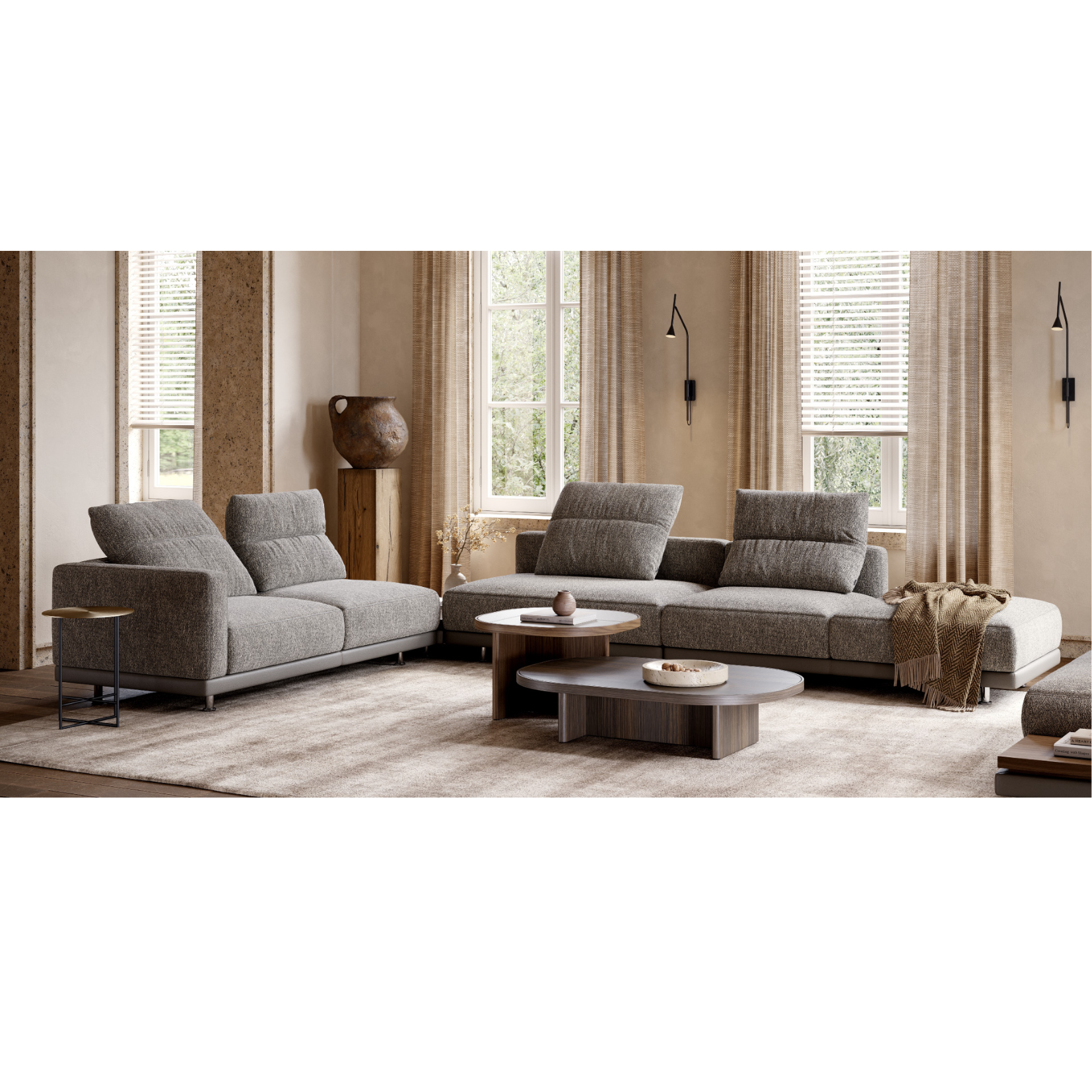 Designed for maximum versatility, the Laurent Modular Sofa adapts to any environment thanks to its wide range of modules and configurable options. Its adjustable foldable cushion allows for different angles and seating positions, enhancing the overall comfort experience. The structured silhouette, with clean lines and light proportions, adds a sophisticated touch, while the spring seat ensures ergonomic support and a plush feel.