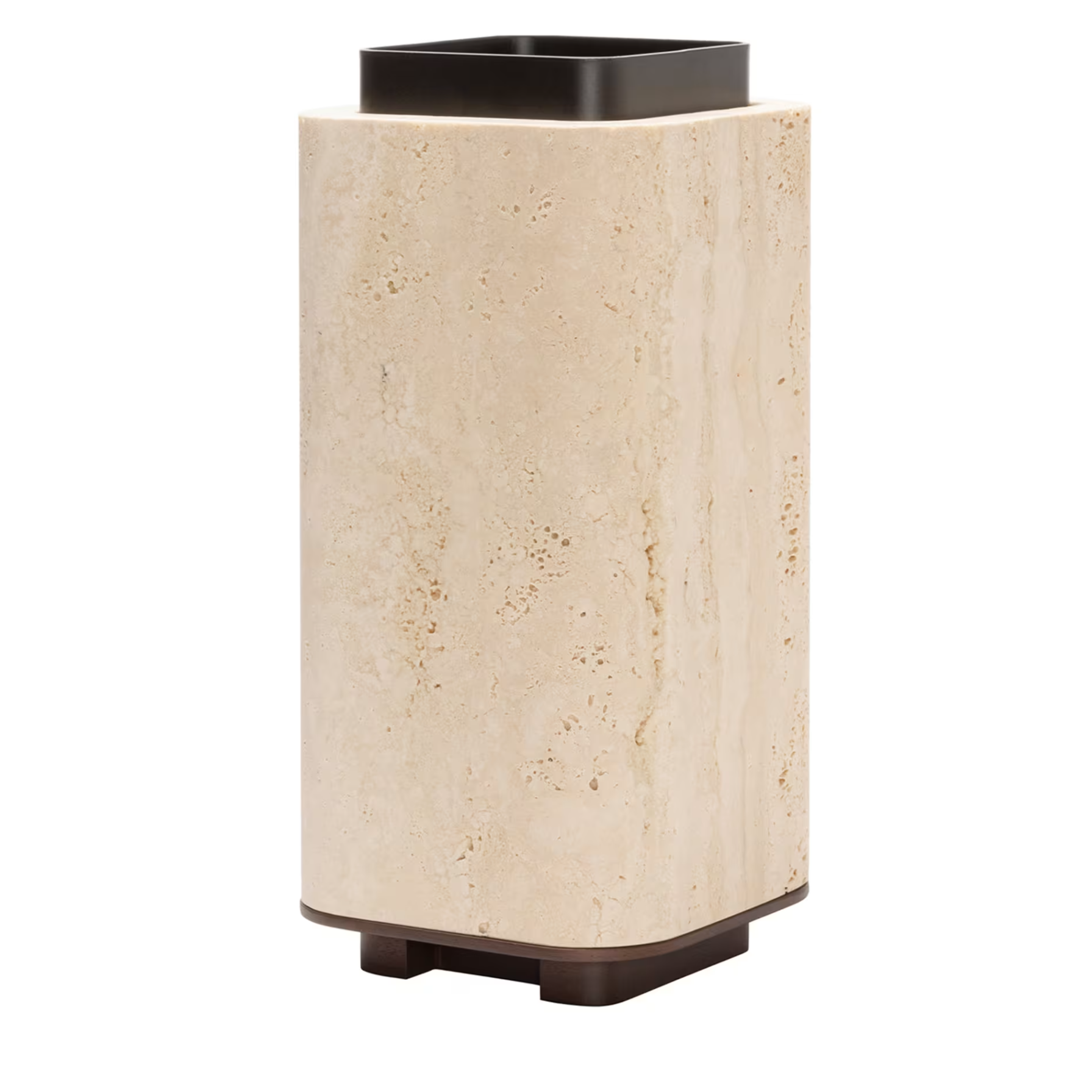 The collection reflects the interaction between elegance and substance. The resulting design is a creation where the succession of solid and void spaces breaks the monolithic vision, and where natural elements such as dark-stained Canaletto walnut wood, travertine, cashmere and wool play a symphony of craftsmanship and aesthetics. Travertine structure with a removable burnished brushed bronze container and a wood base available with walnut or wenge finish. Wood finishes : dark walnut / wenge.